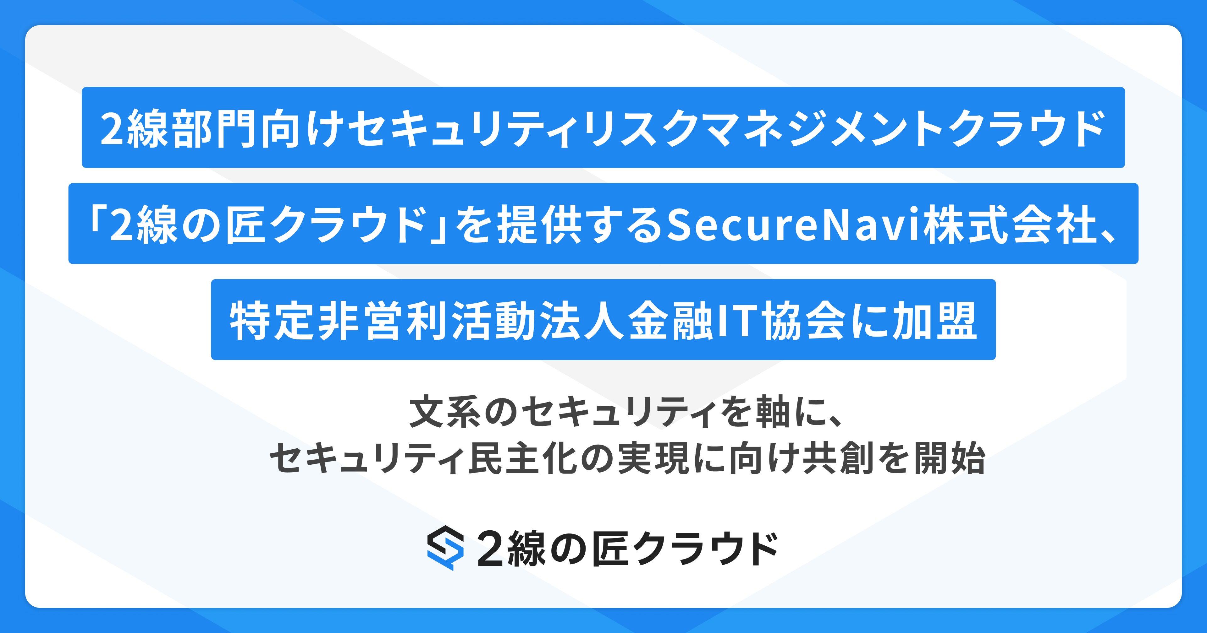 2線部門向けセキュリティリスクマネジメントクラウド「2線の匠クラウド」を提供するSecureNavi株式会社、特定非営利活動法人金融IT協会に加盟