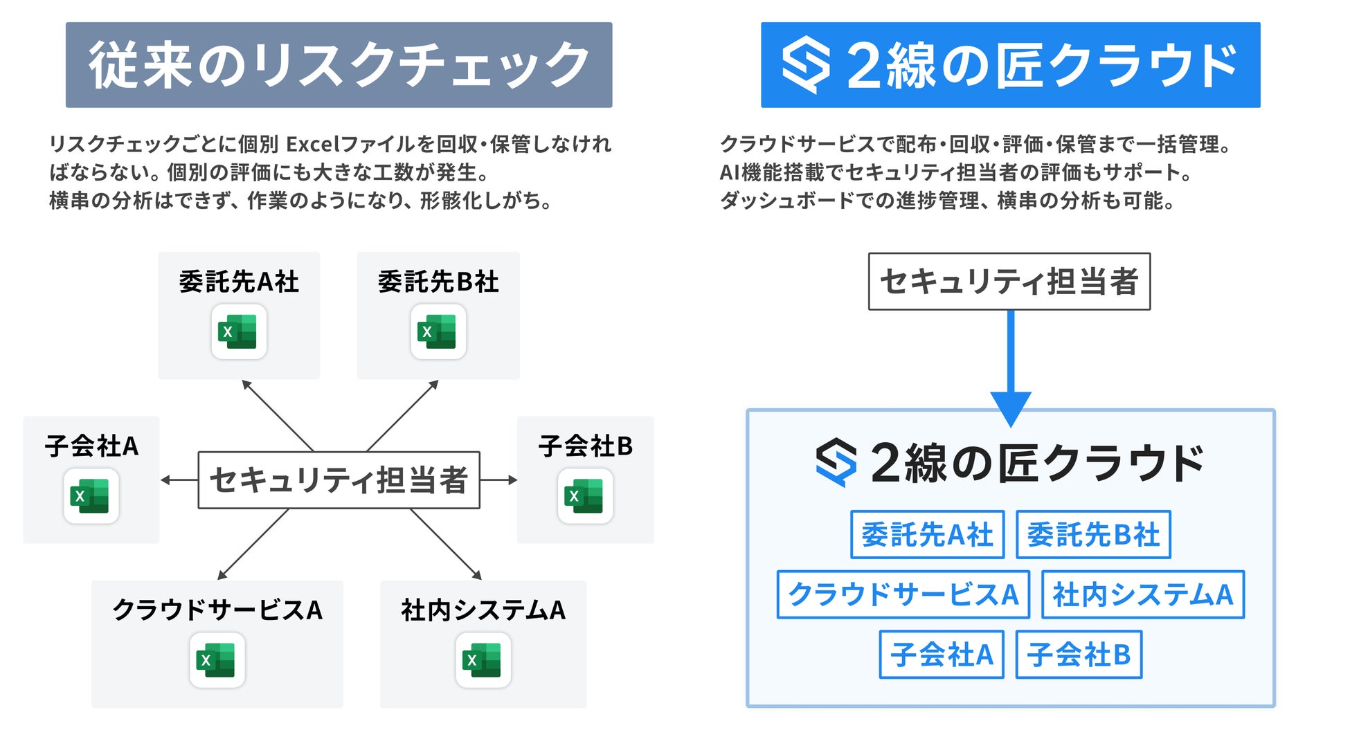「2線の匠クラウド」は、委託先・システム・クラウド・グループ会社など多層的なリスクを、2線部門が自律的にマネジメントできるよう設計されたクラウドプラットフォームです。チェックシート運用を単なる作業ではなく、リスクマネジメントを動かす構造として再設計しています。