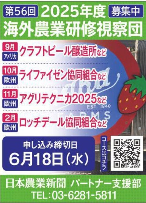 株式会社日本農業新聞(東京都台東区、代表取締役社長:田宮和史郎)は毎年、世界の農業や金融事情を学ぶため「海外農業研修視察団」を各国に派遣しています。2025年度はドイツ・ハノーバーで開かれる農機展「アグリテクニカ2025」(11月9~15日開催)をコースの目玉として視察します。