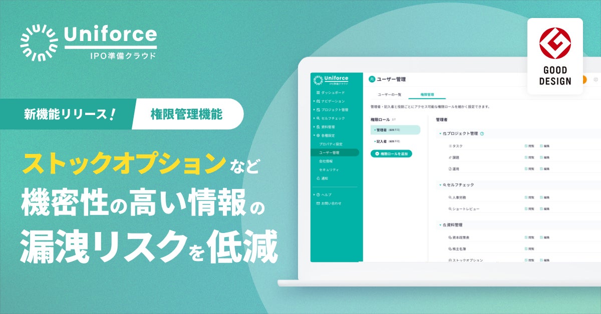 企業フェーズに合わせて持続的な成長の基盤を構築する「ガバナンスグロース」をミッションに掲げるUniforce株式会社(読み:ユニフォース 代表取締役CEO:砂田 和也、以下「Uniforce」)は、IPO準備支援クラウドサービス「IPO準備クラウド」において、機能ごとに詳細な権限設定が可能となる新機能「権限管理機能」を本日リリースしました。これにより、資本政策表やストックオプションなどの機密性の高い情報に対するアクセス制御が柔軟に行えるようになりました。