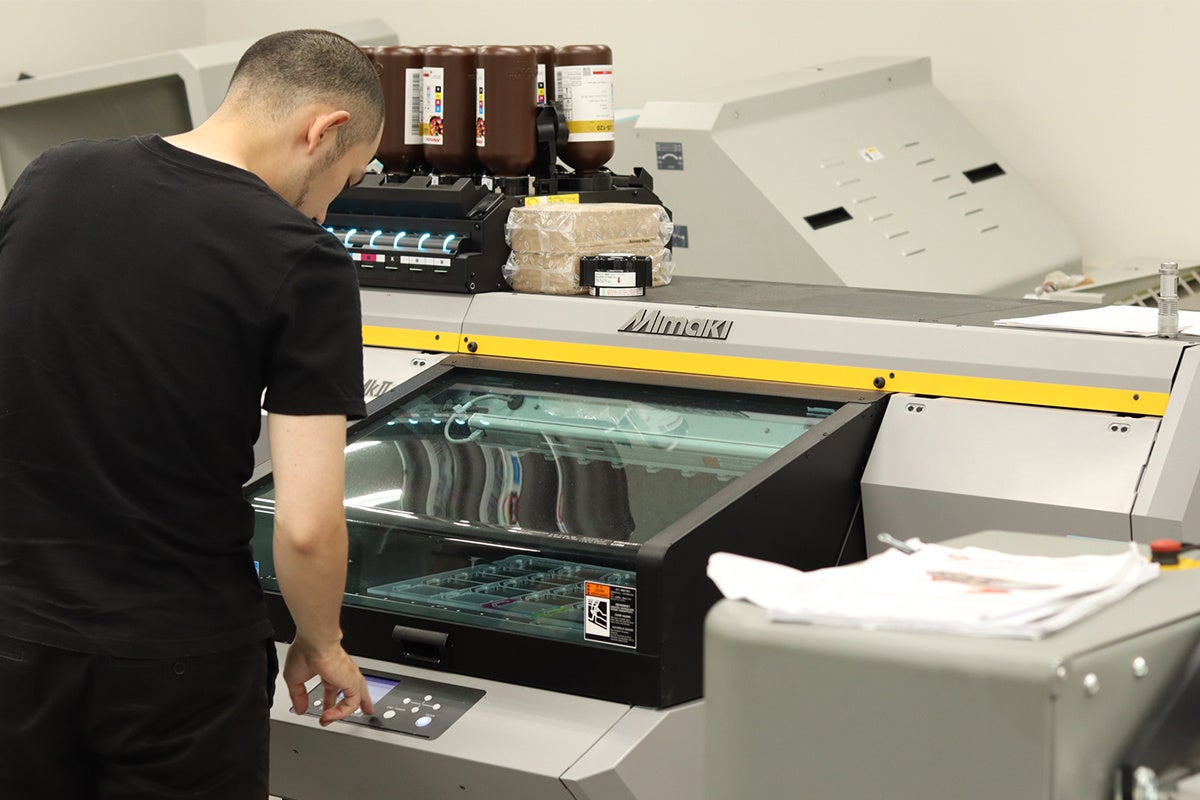 工場ならでは、品質チェックも常に欠かしておりません。作業をする前に、毎朝同じ絵柄を印刷することで色の出方を確認。日付を記入し、それぞれの時期ごとの傾向もチェック。ファン(ユーザー)に安心して購入いただける体制づくりを心がけています。
