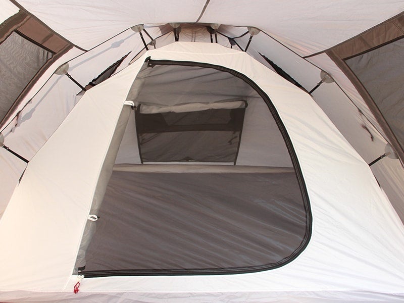 インナーテントのサイド・入口には通気性に優れたメッシュ素材を採用。さらに、寝室と前室には大型の換気用窓を設けることで、空気の循環を促し、夏場の蒸し暑さを軽減します。