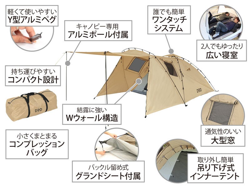 ビーズ株式会社(本社:大阪府東大阪市、代表取締役社長:大上響)が展開するアウトドアブランド「DOD」では、女子キャンプや夏フェスシーンで便利に活用いただける2~3人サイズのワンタッチテント「ライダーズタンデムテント」を好評販売中です。