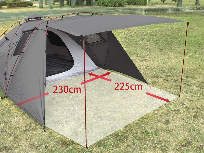 「ライダーズタンデムテント」は2~3人でゆったりくつろげる広さと日陰スペースまでを備えながら、ワンタッチ構造で初心者でも簡単に設営可能。
