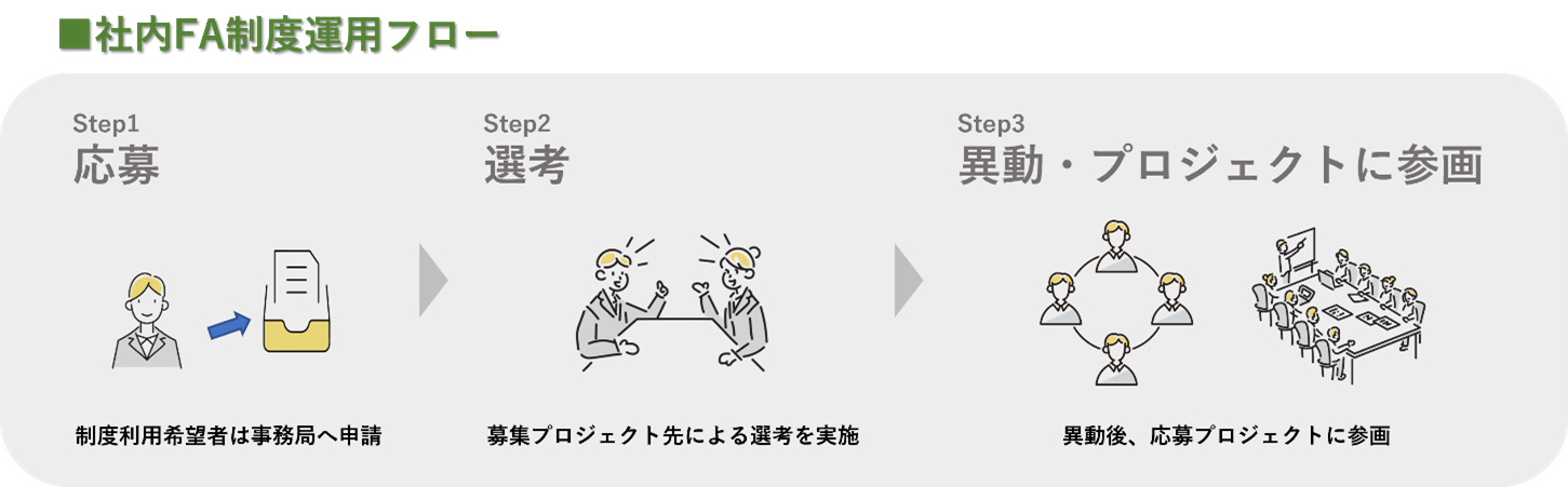 社内FA制度は、全部署を対象に自ら募集プロジェクトへ異動申告ができる制度です。本人からの応募の後、募集プロジェクト先による選考を実施したうえで、新たなプロジェクト・業務に従事することができるようになります。