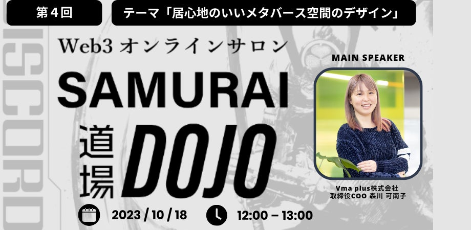 これまでSAMURAI道場のMCを務めてきたVma plus株式会社の取締役COO森川をメインスピーカーに迎え、メタバースへの滞在や再来の動機に密かにつながる「メタバース空間のデザイン」について「居心地」にフォーカスを当ててお話ししてまいります。