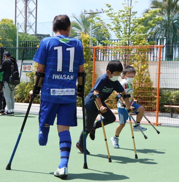 杖で体を支えながら行うサッカーを体験できます。元日本代表選手の新井誠治選手が教えてくれます。