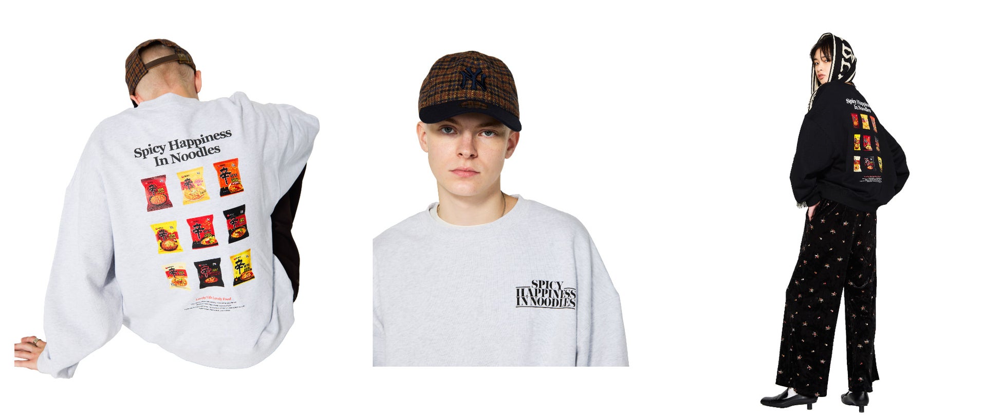 昨年に続く、コラボ第2弾となる今回は、秋冬らしい“辛”の文字を組み込んだオリジナルのノルディック柄のデザインと象徴的な”辛”ロゴをあしらったデザインのニット2型と、「辛ラーメン」の製品パッケージを並べたプリントデザインと「辛ラーメン」ブランドグローバルキャッチコピーの「Spicy Happiness In Noodles」を着こなしやすく落とし込んだスウェット2型、昨今トレンドのフットボールマフラーをベースにしたマフラー1型の男女問わず着用できる合計5型をラインナップ。