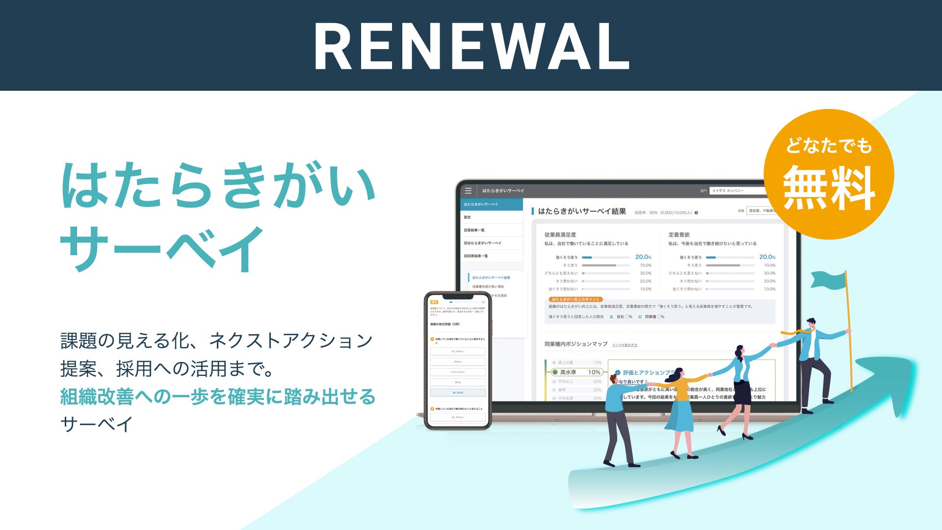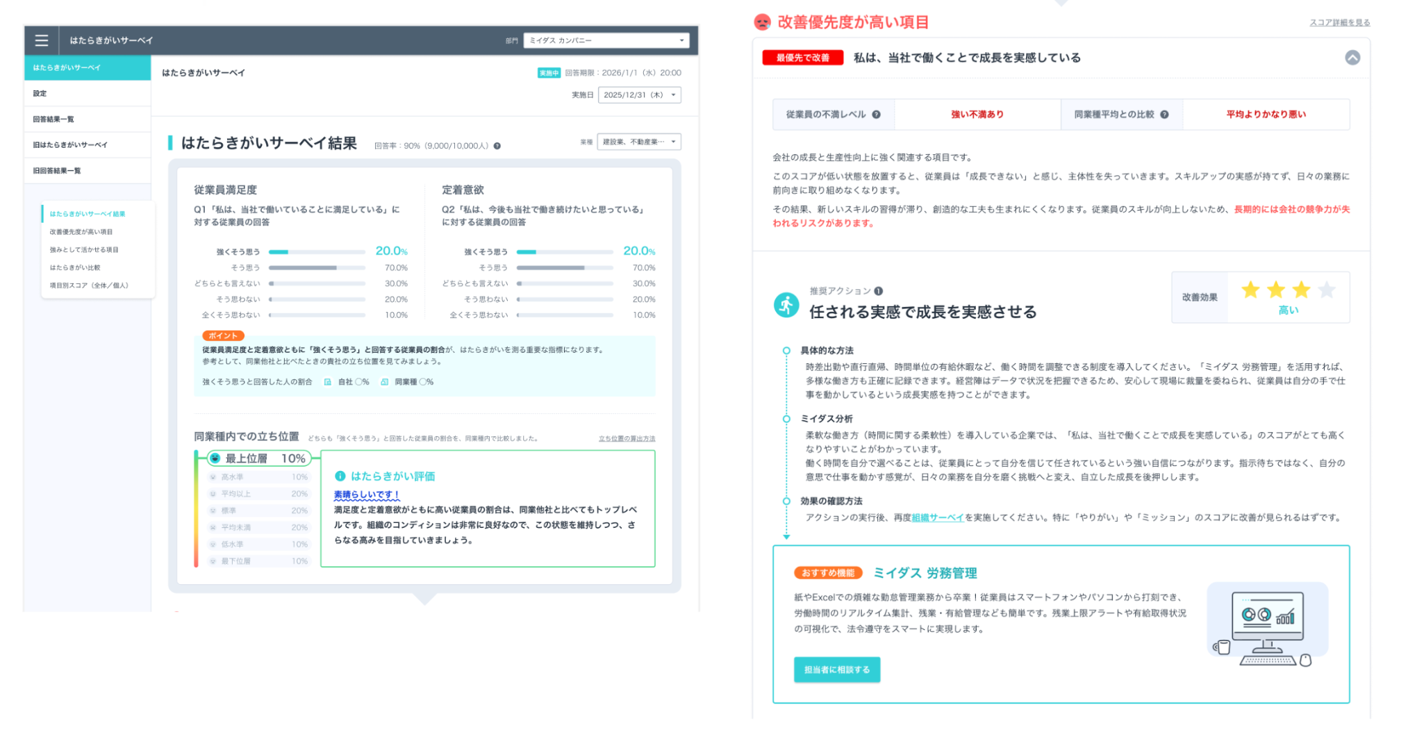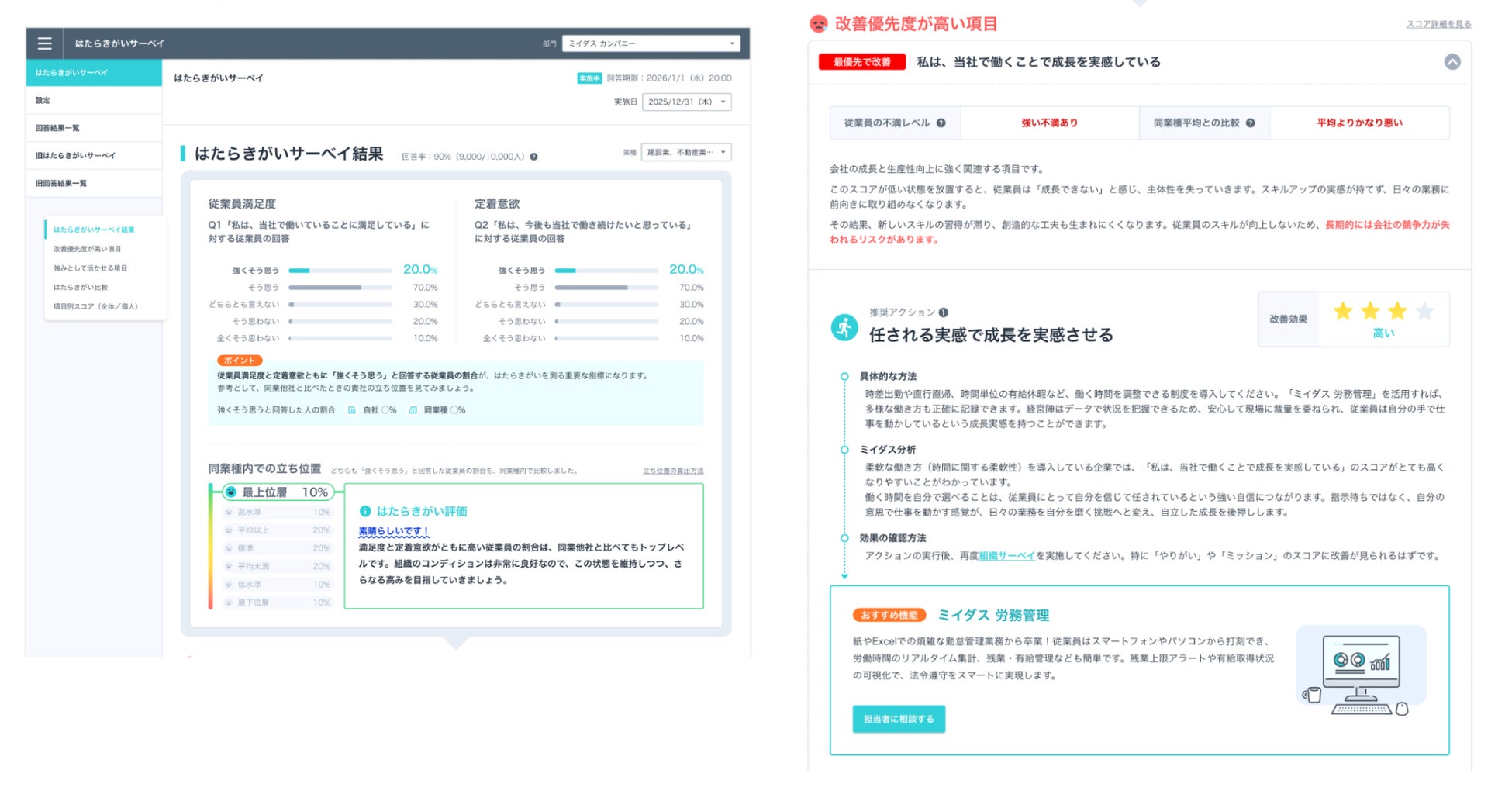 「はたらいて、笑おう。」をビジョンに掲げるパーソルグループのミイダス株式会社(本社:東京都品川区、代表取締役社長:後藤 喜悦、以下「当社」)は、中途採用支援サービス『ミイダス』を提供しています。このたび、従業員のはたらきがいを「満足度」と「重要度」の両面から可視化するサービス「はたらきがいサーベイ」※に、業種内での自社の立ち位置を客観的に可視化できる「同業種比較」機能と、サーベイの結果から具体的な改善アクションを提示する「改善指針提示」機能を新たに加え、2026年3月4日よりリニューアルします。