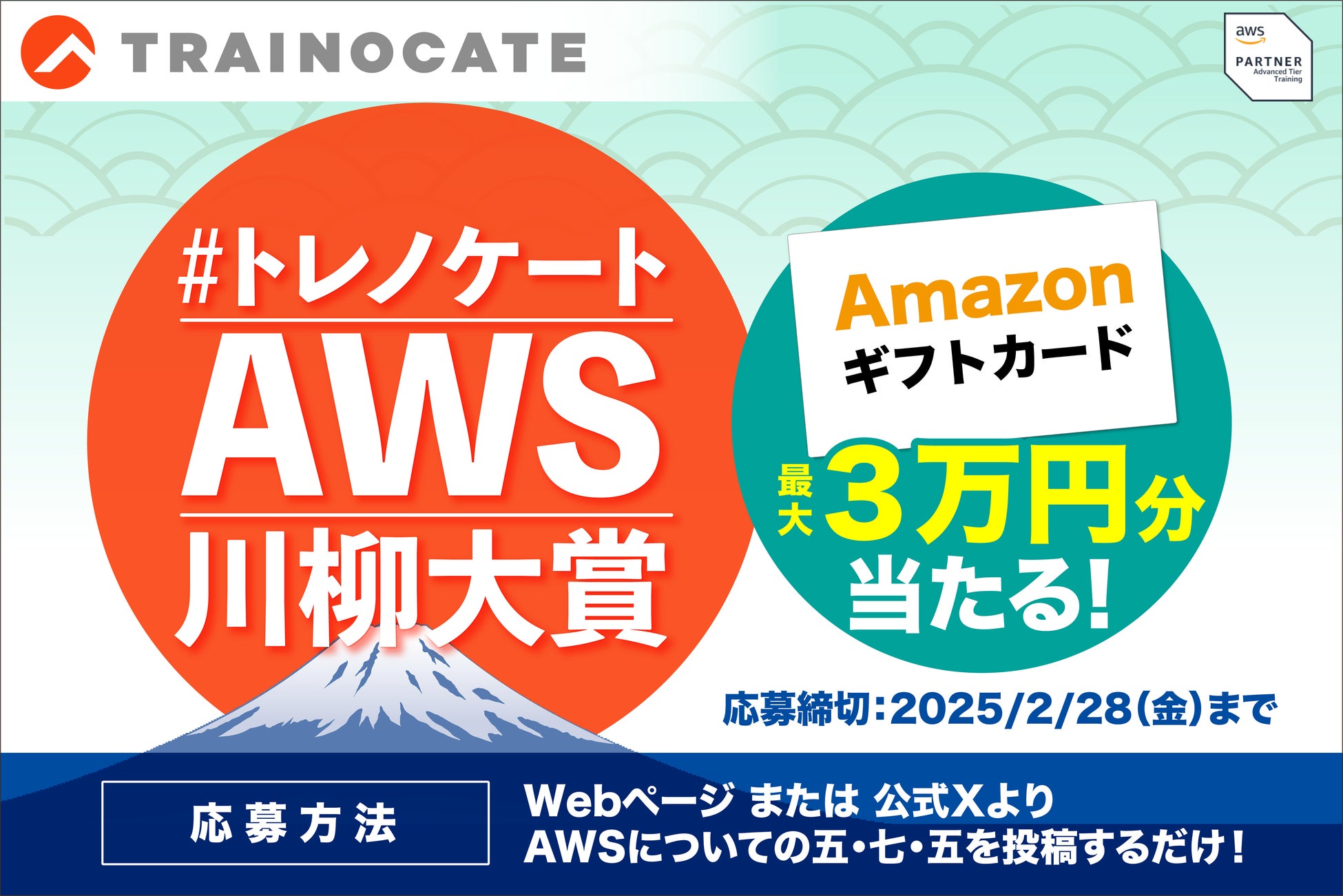 人材育成を手掛けるトレノケート株式会社(本社:東京都新宿区、代表取締役社長:早津 昌夫、以下トレノケート)は、アマゾン ウェブ サービス(以下、AWS)のクラウド活用に関するさまざまなエピソードや悩み、今年の抱負等を五・七・五の形式で詠む『#トレノケートAWS川柳大賞』を2025年1月28日(火)から2025年2月28日(金)まで開催いたします。AWSに対する熱い想いや日々の業務で感じたことを川柳に込め、ぜひご参加ください。皆さまからのたくさんのご応募を心よりお待ちしております。