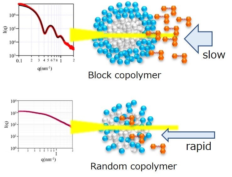 本研究の結果、ブロックコポリマーミセルはコアシェル構造を、ランダムコポリマーミセルはランダムコイル構造を形成していることが明らかとなりました。また、ブロックコポリマーミセルはランダムコポリマーミセルよりも染料の可溶化量は高かったものの、可溶化速度はランダムコポリマーよりも遅く、可溶化がゆっくりと時間をかけて進行することがわかりました。これらはポリマーミセルのサイズ、コアサイズ、コアシェル構造、界面のコントラストが大きく影響している可能性が示唆されました。