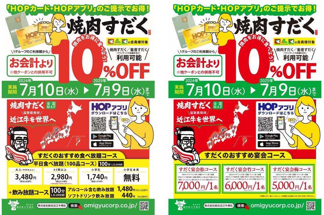 株式会社総合近江牛商社(本社:滋賀県守山市/代表取締役社長:西野 立寛)が展開する【焼肉すだく/畜産すだく】は株式会社平和堂の「HOP」会員限定への割引優待サービスを開始する。「HOP」会員およびその同伴者は、店頭での「HOPカード(HOP-VISAを含む)」または「HOPアプリ」の会員証画面の提示で焼肉すだくで割引を受けることができるようになる。