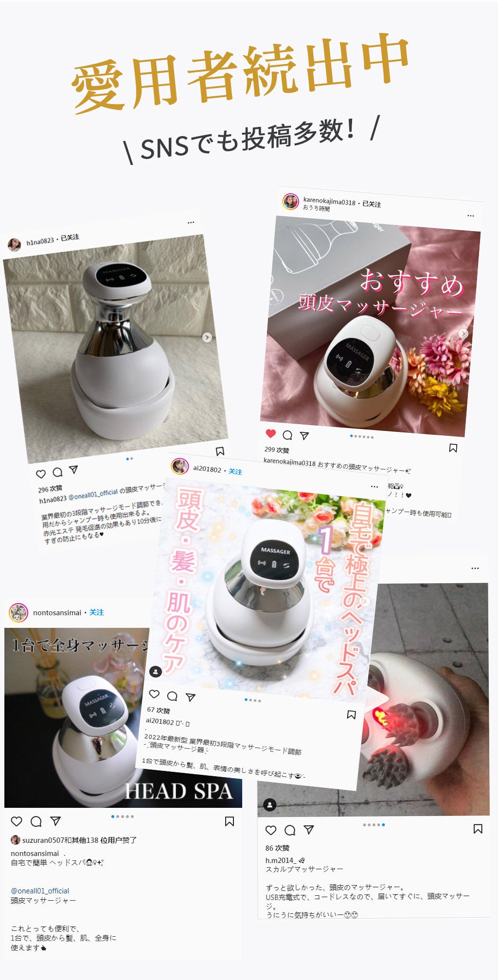 頭皮はもちろん、首、肩、腕、足などにもご使用いただけます。柔らかすぎず肌に優しいシリコンアタッチメントを採用、快適で皮膚を傷つけず、長時間使用可能な設計を実現。