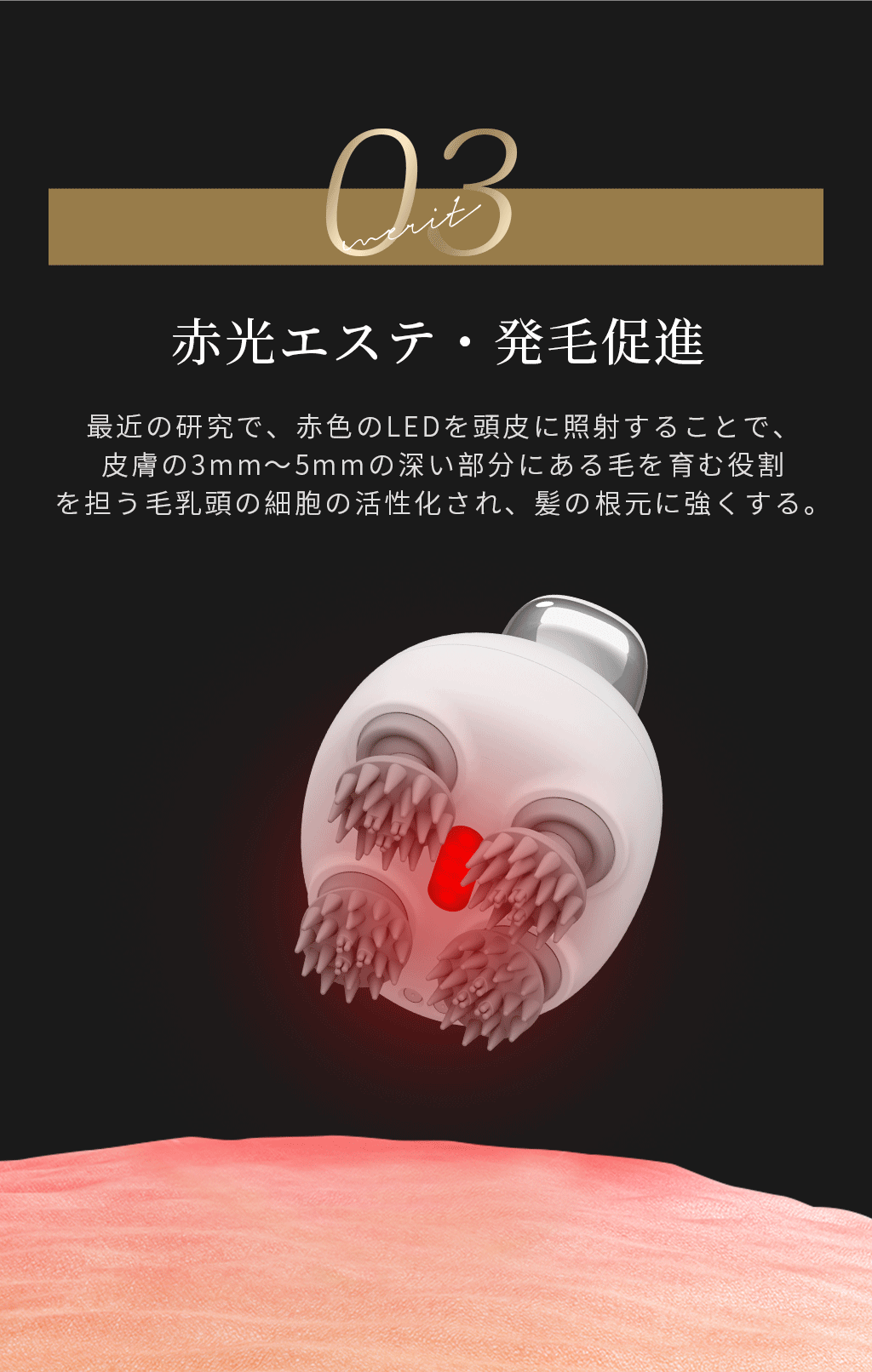 エステサロンや美顔器でもよく使われている赤光エステは髪の根元に強くする。LEDの光が毛乳頭細胞に届くと、細胞から特殊なシグナルが発信されるメカニズムのためです。毎日10分位ほど使えると、毛髪のボリュウーム感UPを実現できます。10分後にマッサージ作動は自動に停止となります。使用すぎを防止します。