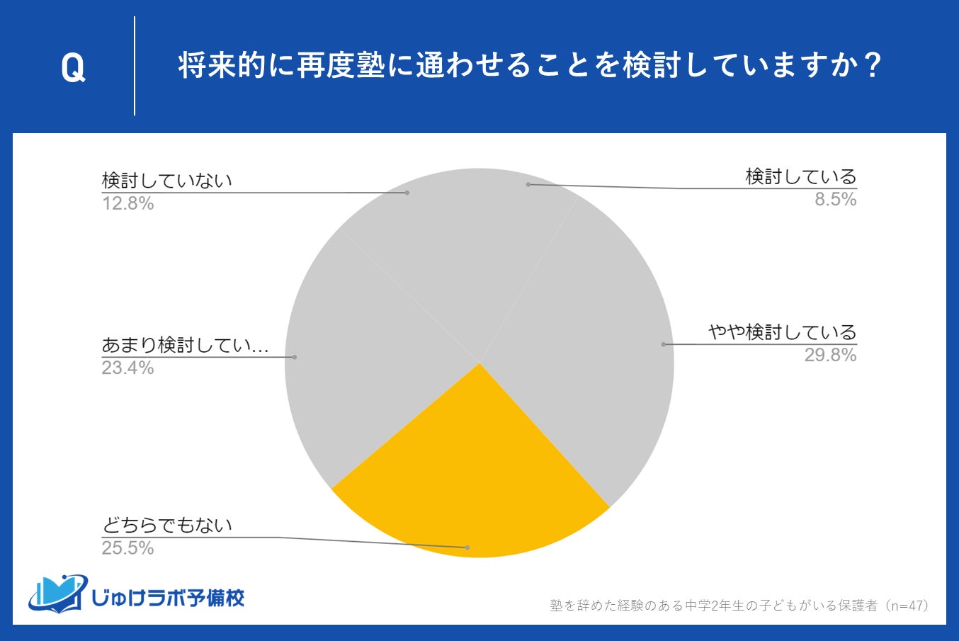 「どちらでもない」と回答した保護者が25.5%で、再度塾に通わせるかどうかについて明確な決断をしていない家庭が多いことがわかりました。この結果は、塾通いの必要性や効果について家庭内での議論が重要であることを示しています。