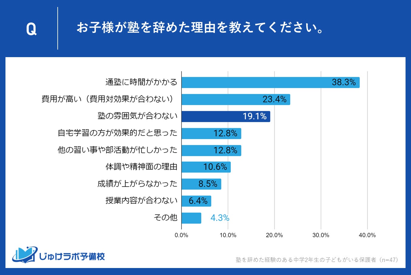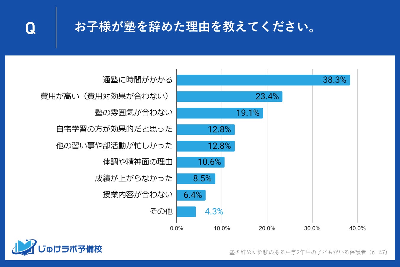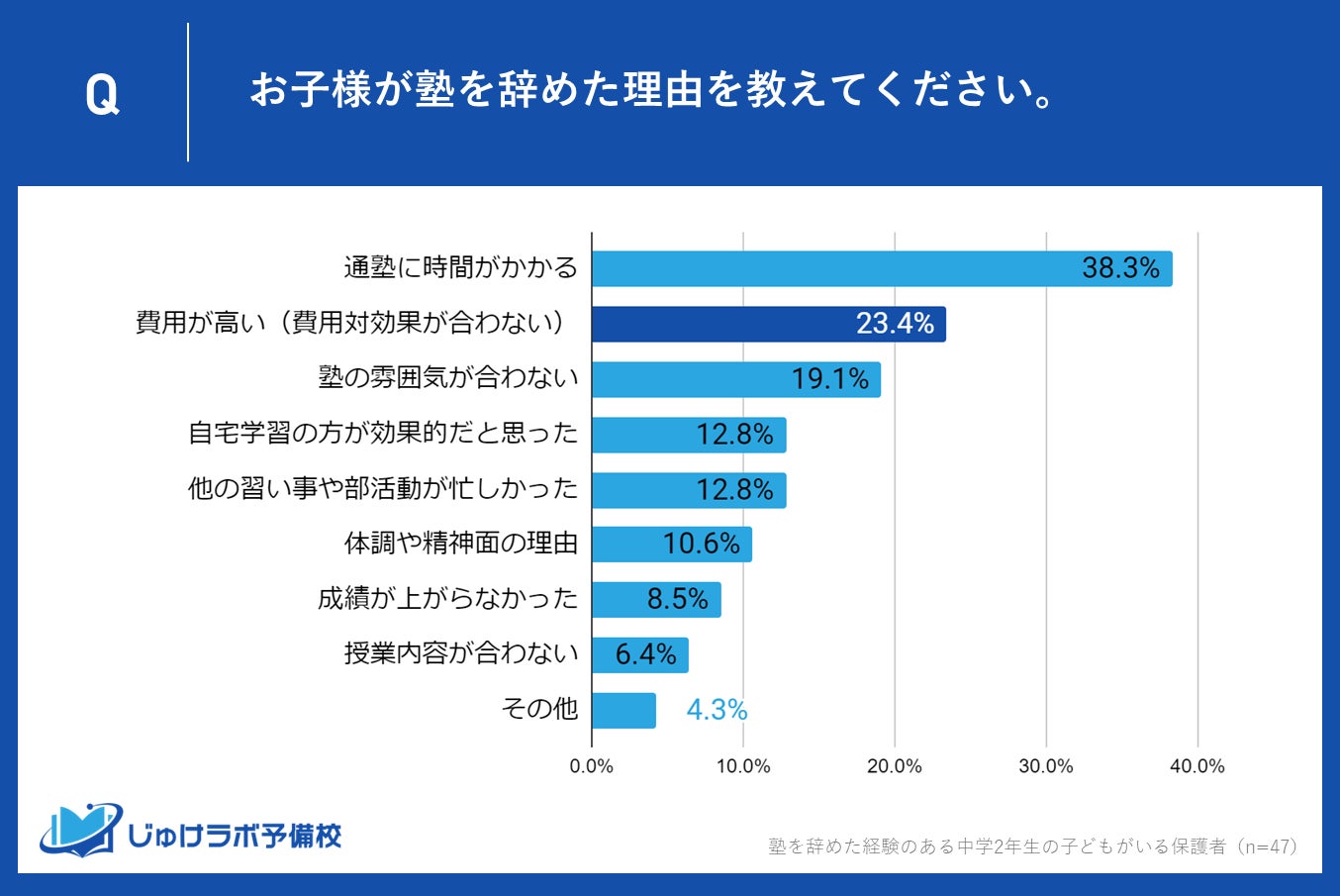 最も多くの保護者が塾を辞める理由として挙げたのは「通塾に時間がかかる」ことで、38.3%がこの理由を選びました。また、「費用対効果が合わない」ことを理由に挙げた保護者は23.4%でした。学習環境や授業の質も重要視され、「塾の雰囲気が合わない」と回答した保護者は19.1%に上りました。