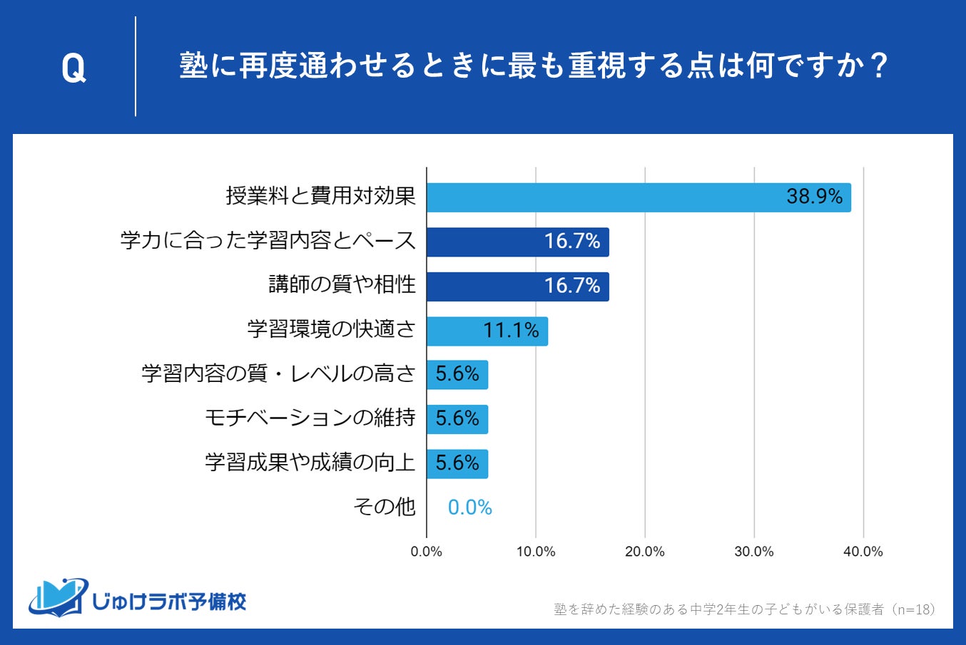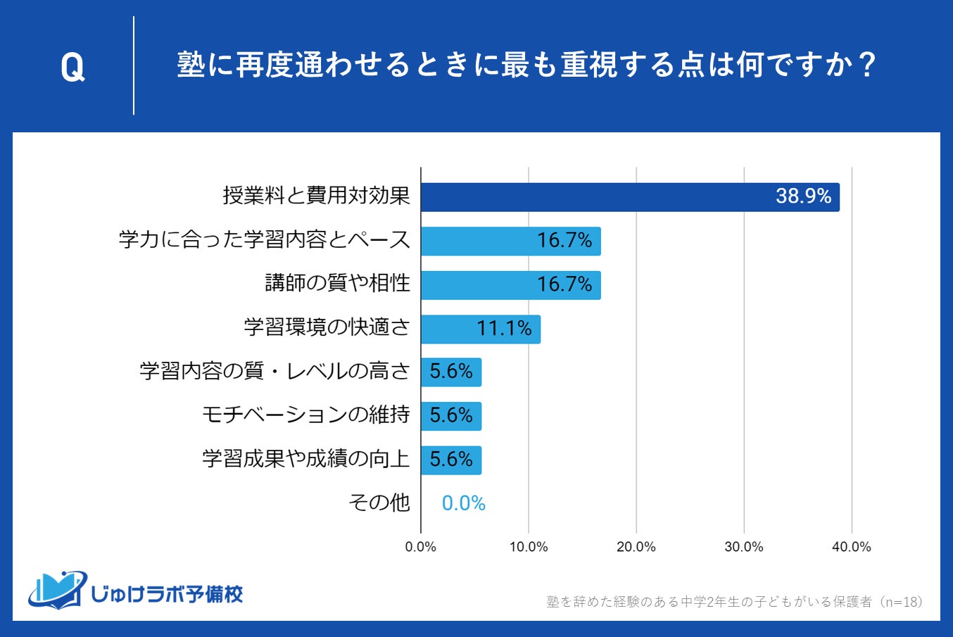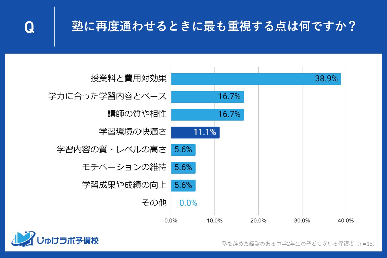 再度塾に通わせる際に最も重視する点としては、「授業料と費用対効果」が38.9%で最多、次いで「学力に合った学習内容とペース」および「講師の質や相性」が16.7%で同率でした。学習環境の快適さも11.1%の保護者が重視していることがわかりました。