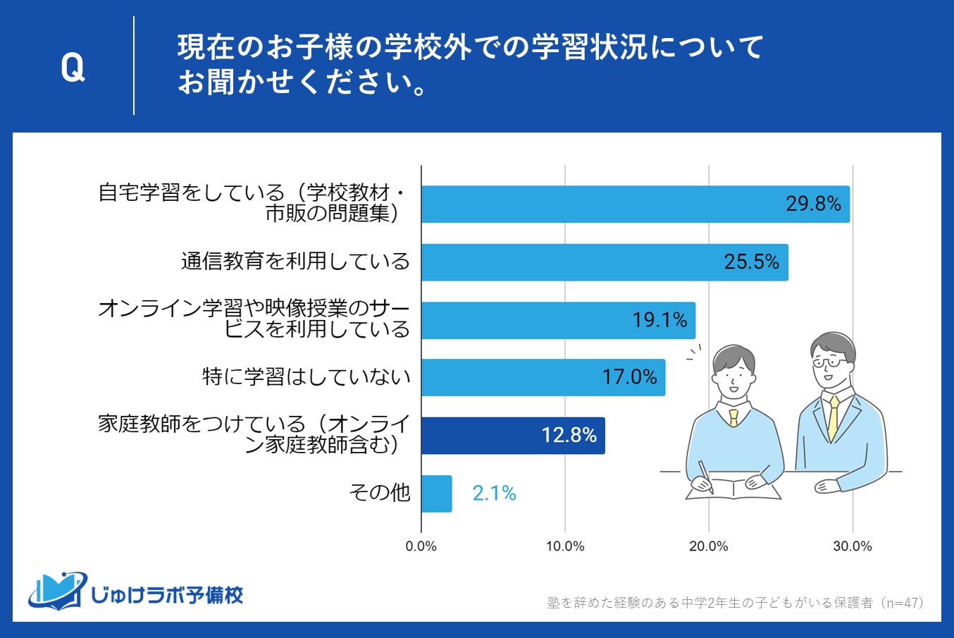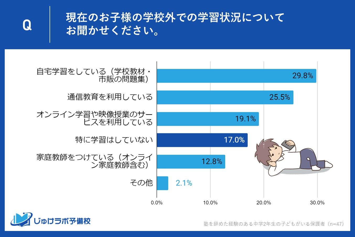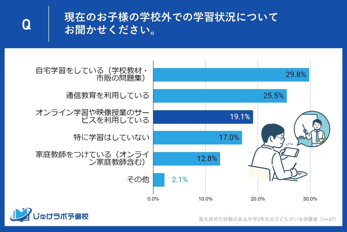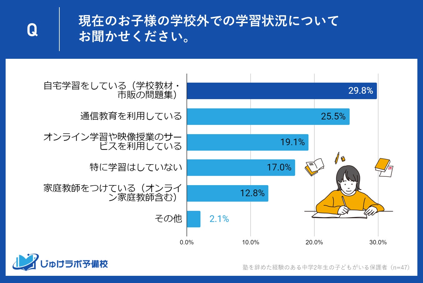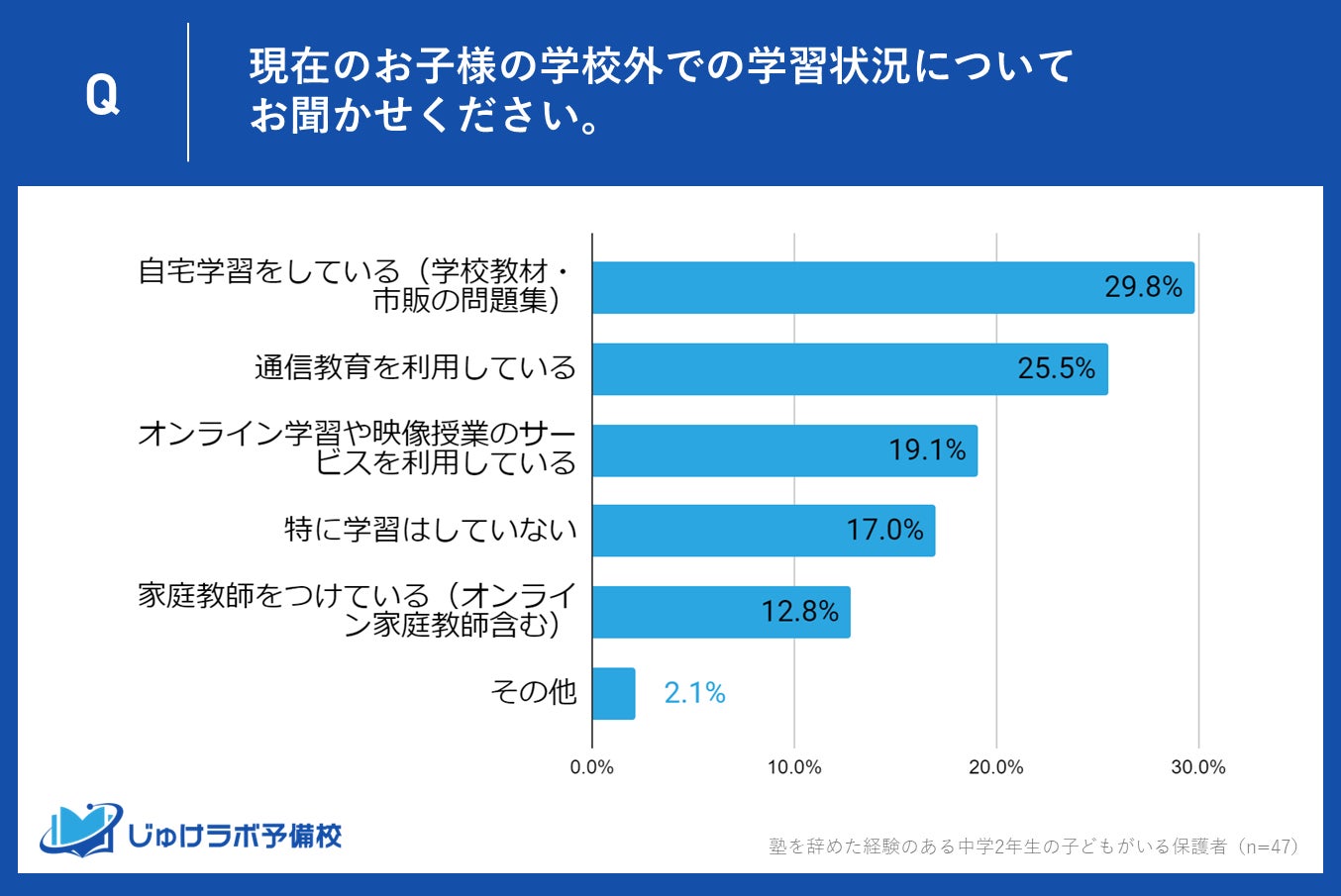 塾を辞めた後の学習方法としては、「自宅学習(学校教材・市販の問題集)」が29.8%で最多、次いで「通信教育」を利用している家庭が25.5%、「オンライン学習や映像授業のサービス」を利用している家庭が19.1%でした。さらに、17.0%の家庭が特に学習をしていないことがわかりました。