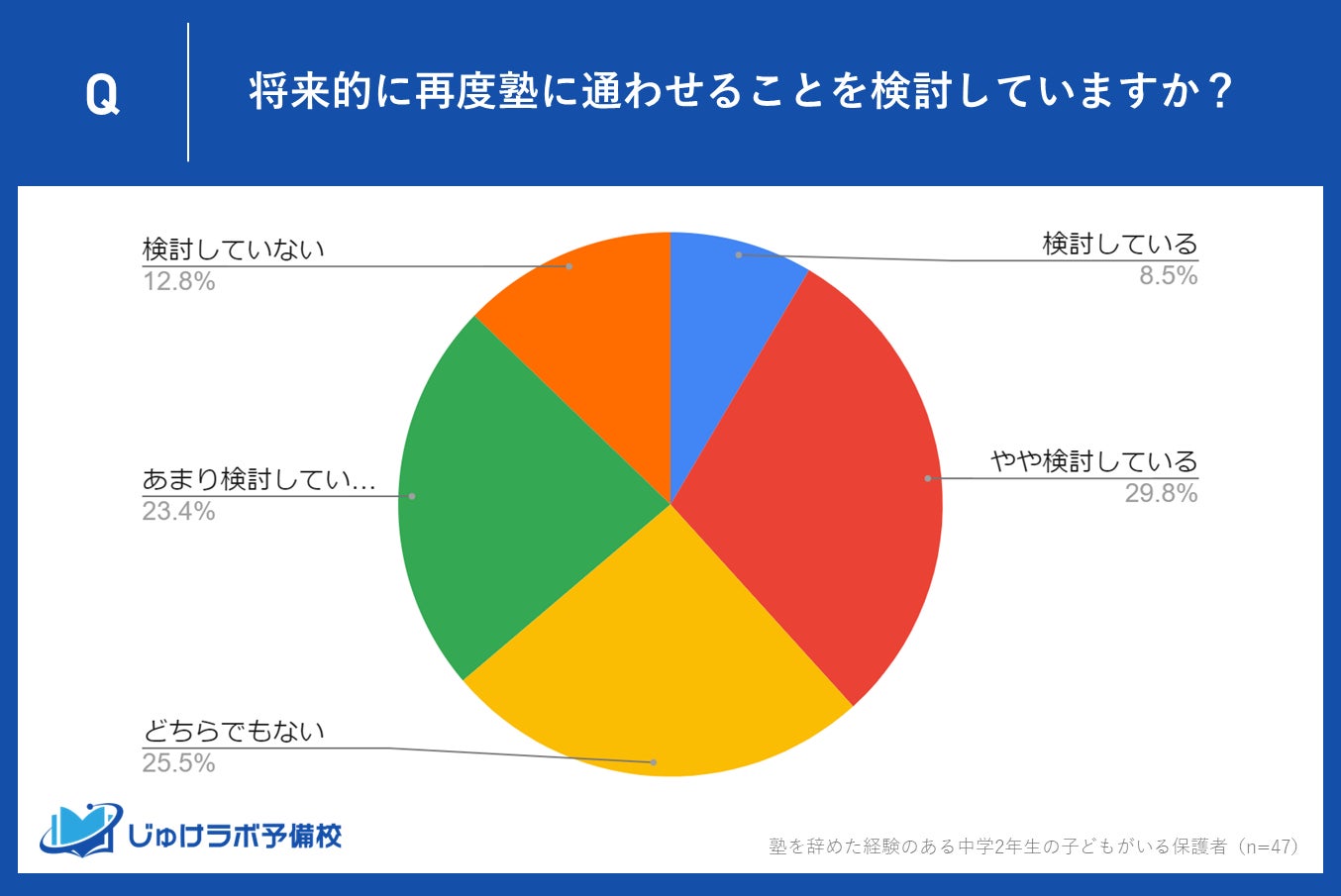 将来的に再度塾に通わせることを検討しているかについての調査結果では、「やや検討している」と回答した保護者が最も多く、29.8%を占めました。検討していると回答した8.5%を合計すると38.3%の中2の保護者が今後塾への再通塾を検討している事がわかりました。