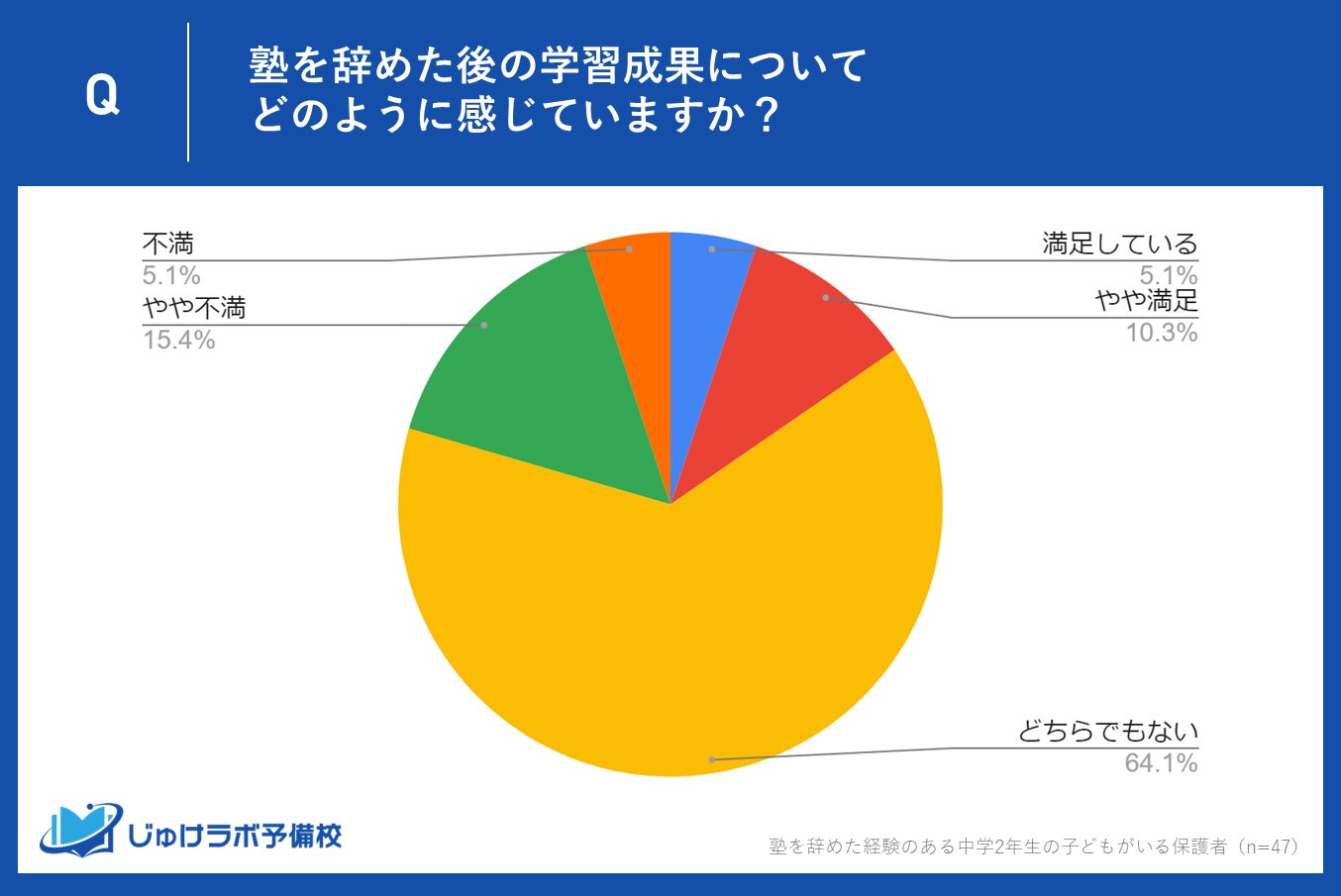 塾を辞めた後の学習成果についての調査結果から、「どちらでもない」と回答した保護者が最も多く、64.1%を占め、学習成果に満足している中2保護者は15.4%(満足している5.1%・やや満足10.3%)しかいませんでした。