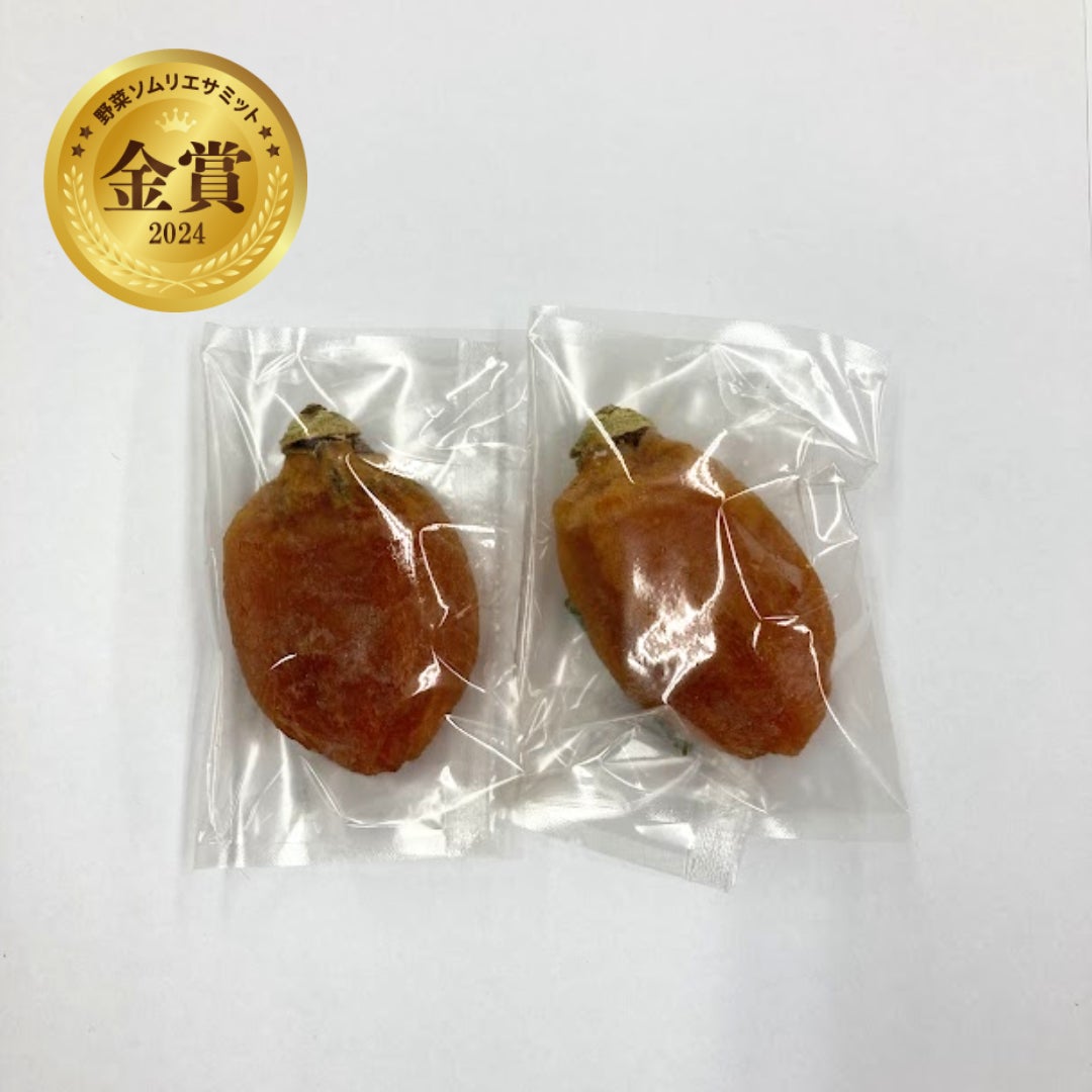 20度を超える甘味と栄養豊富な柿を絶妙な水分に乾燥させました。もっちりとゼリーのような食感と濃縮された、しかしくどくない甘味はついつい食べてしまいます。程よい水分に仕上げたことによって他の干柿と一線を画すかもしれません。まさに「うちの干柿は干柿を苦手な人でも大丈夫です」とオススメできてしまうような干柿※エントリーシートより抜粋