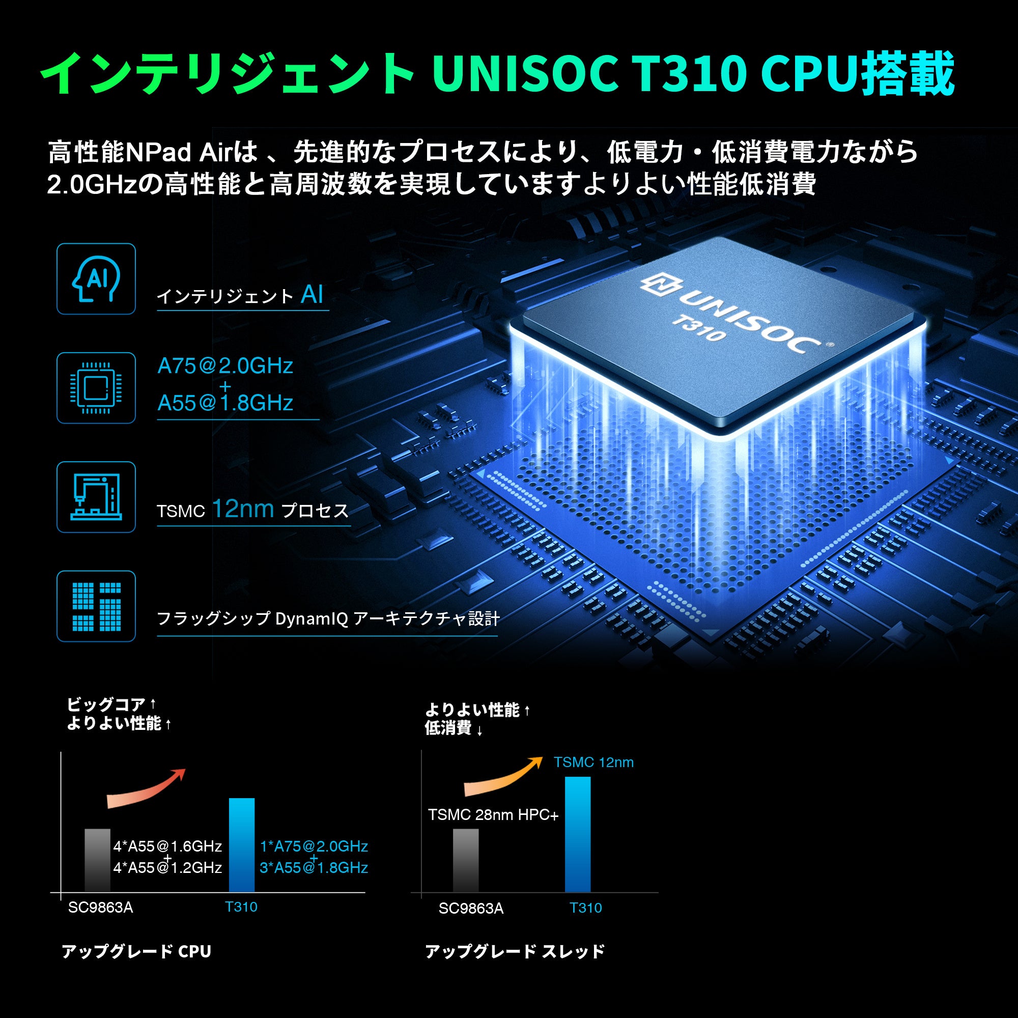 【高性能CPU+10インチ FHD】NPad Airの UNISOC T310は、TSMCの12nmプロセスで製造され、DynamIQアーキテクチャを使用して、パフォーマンスと消費電力を考慮したチップフレームワークを実現し、3つの高効率「A55」コアと複数のCPUコアが連携して動作します。また、学習、エンターテインメント、仕事の効率を大幅に向上させる超省電力機能を備えています。Antutuのランニングスコアは16w点と高く、9863aに比べて性能向上率が高い.10.1インチの1920x1200の解像度を搭載し、ディスプレイはより繊細で滑らかで、視覚効果が優れています