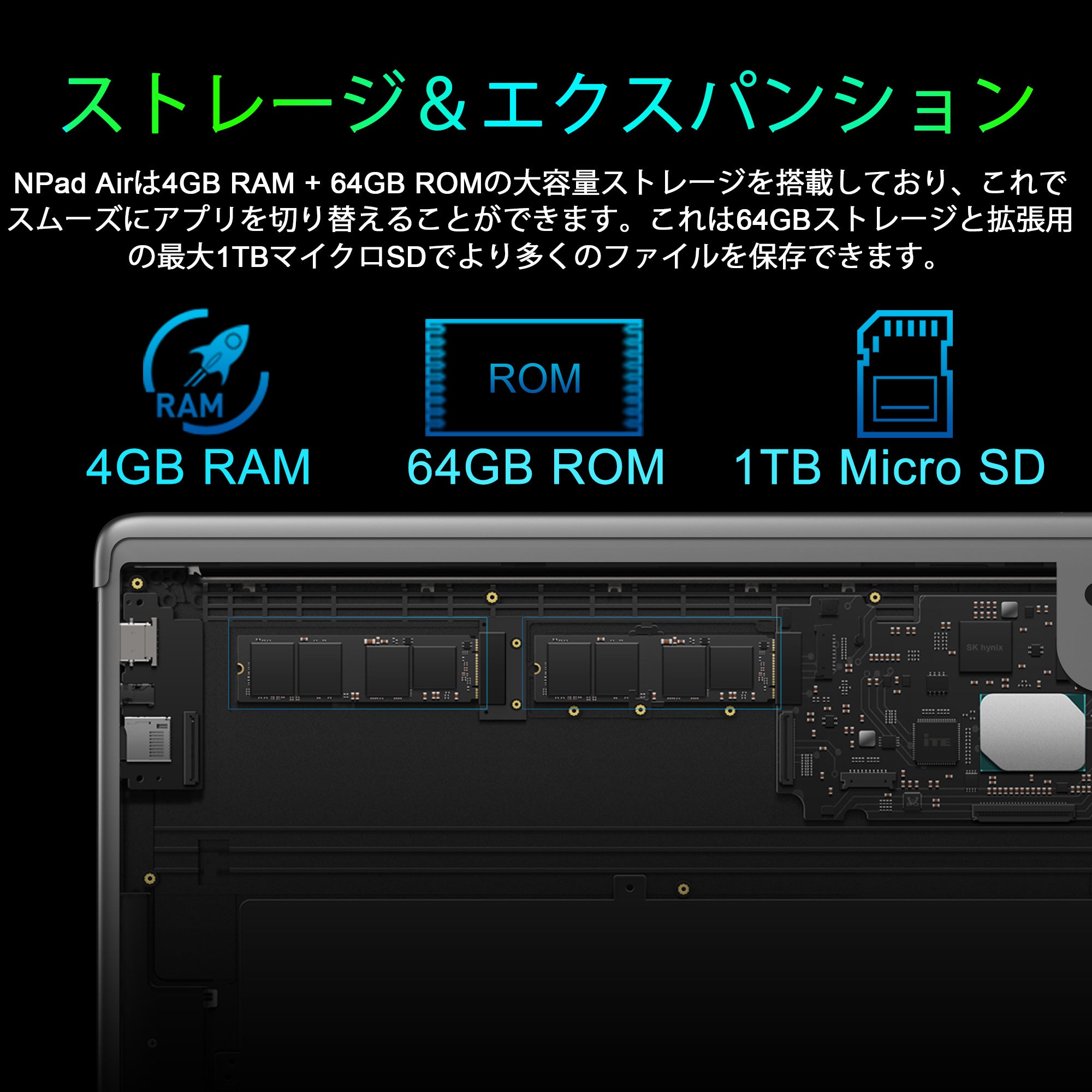 【大容量ストレージ+長寿命】4GBのRAM(メモリー)と64GBのROM(高速ストレージ)を搭載し、MicroSDカードによる拡張ストレージに対応。タブレットの大容量ストレージにより、Webサイトやビデオをスムーズに視聴し、頑丈なアプリや高品質のゲームを楽しむことができます。また、最大6600mAhの大容量バッテリーで最大6時間の連続再生が可能です。NPad Airは、最大1TBの容量のTFカードもサポートし、より多くのニーズを満たすためにストレージスペースを拡張します。