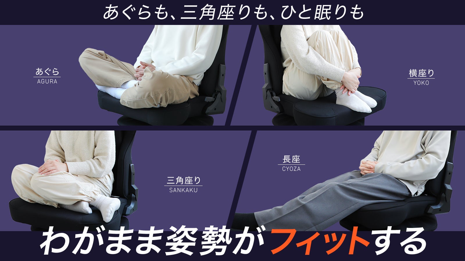 あぐらを組みやすいワイド座面:フルフラット設計で、どんな座り方でも快適。