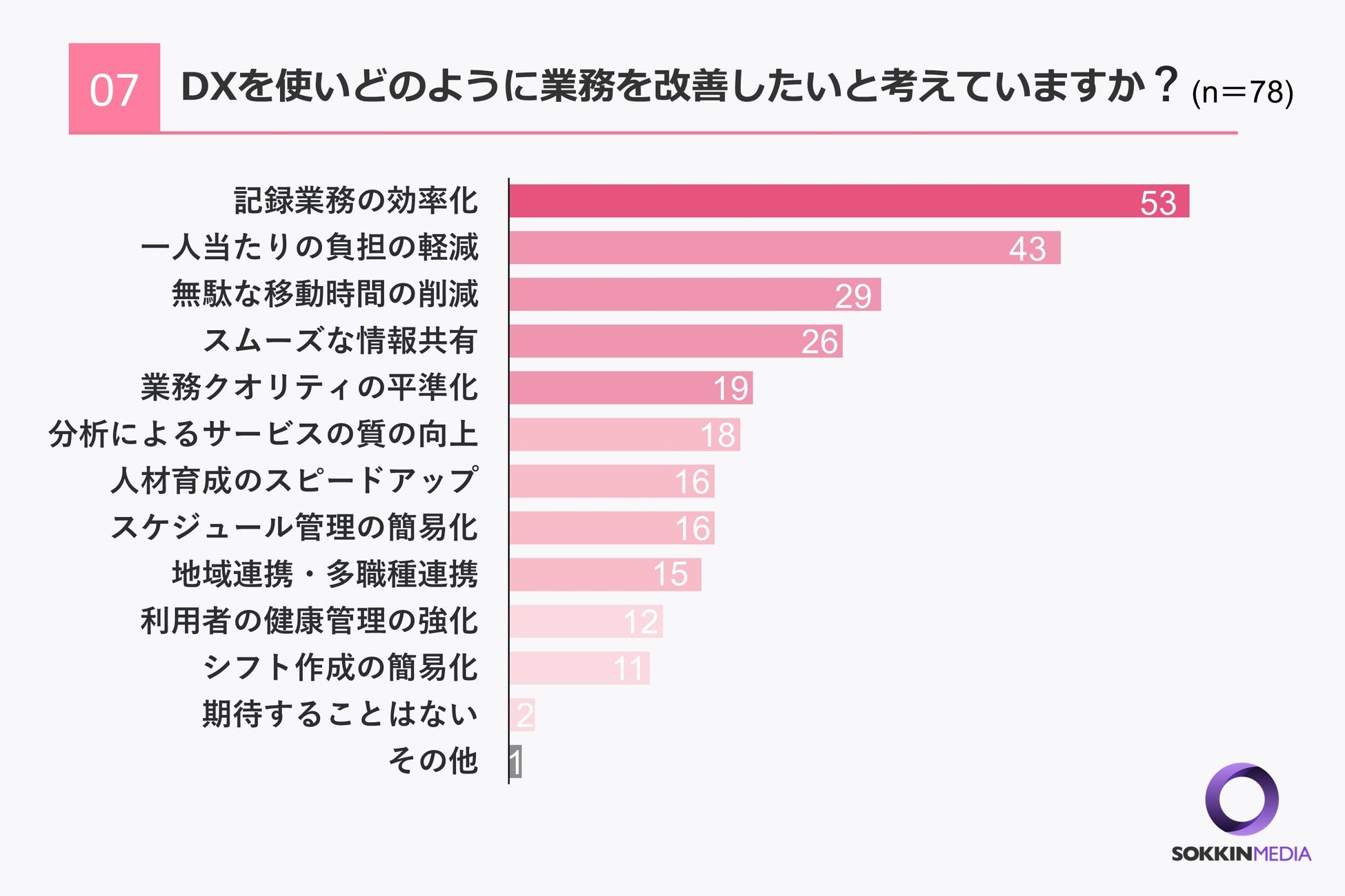 「Q7.DXを使いどのように業務を改善したいと考えていますか ?」という問いに対して、「記録業務の効率化」が最多となり53票、ついで「一人当たりの負担の軽減」が43票という結果になりました。全体を見ても各選択肢に多くの票が集まっているため、DXを用いて業務内容を改善したいと思う方が多いことがわかります。