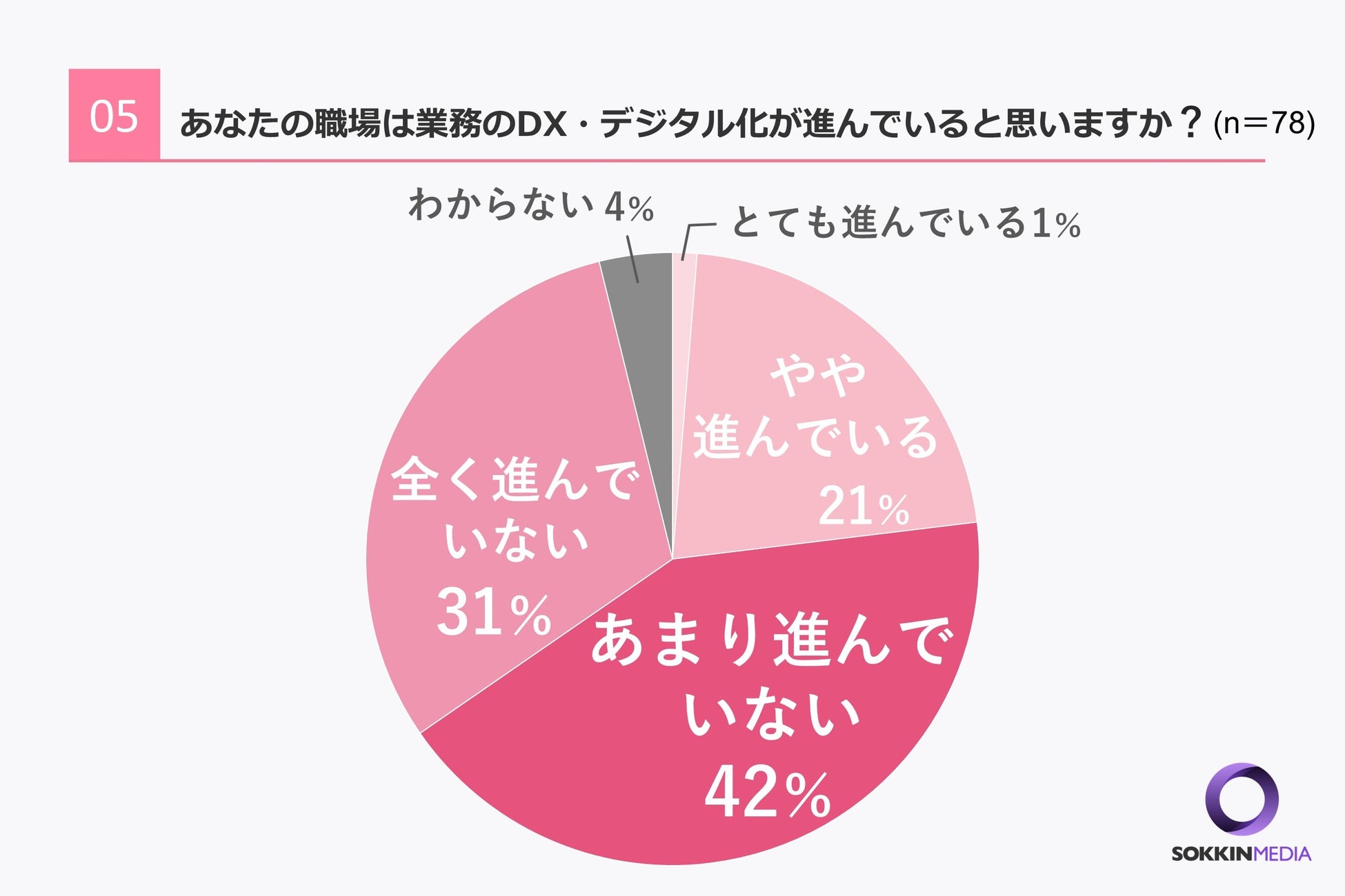 「Q5. あなたの職場は業務のDX・デジタル化が進んでいると思いますか?」という問いに対して、「あまり進んでいない」という回答が42%、ついで「全く進んでいない」という回答が31%という結果になりました。DXが進んでいない職場が70%強であるため、一層の促進が求められます。