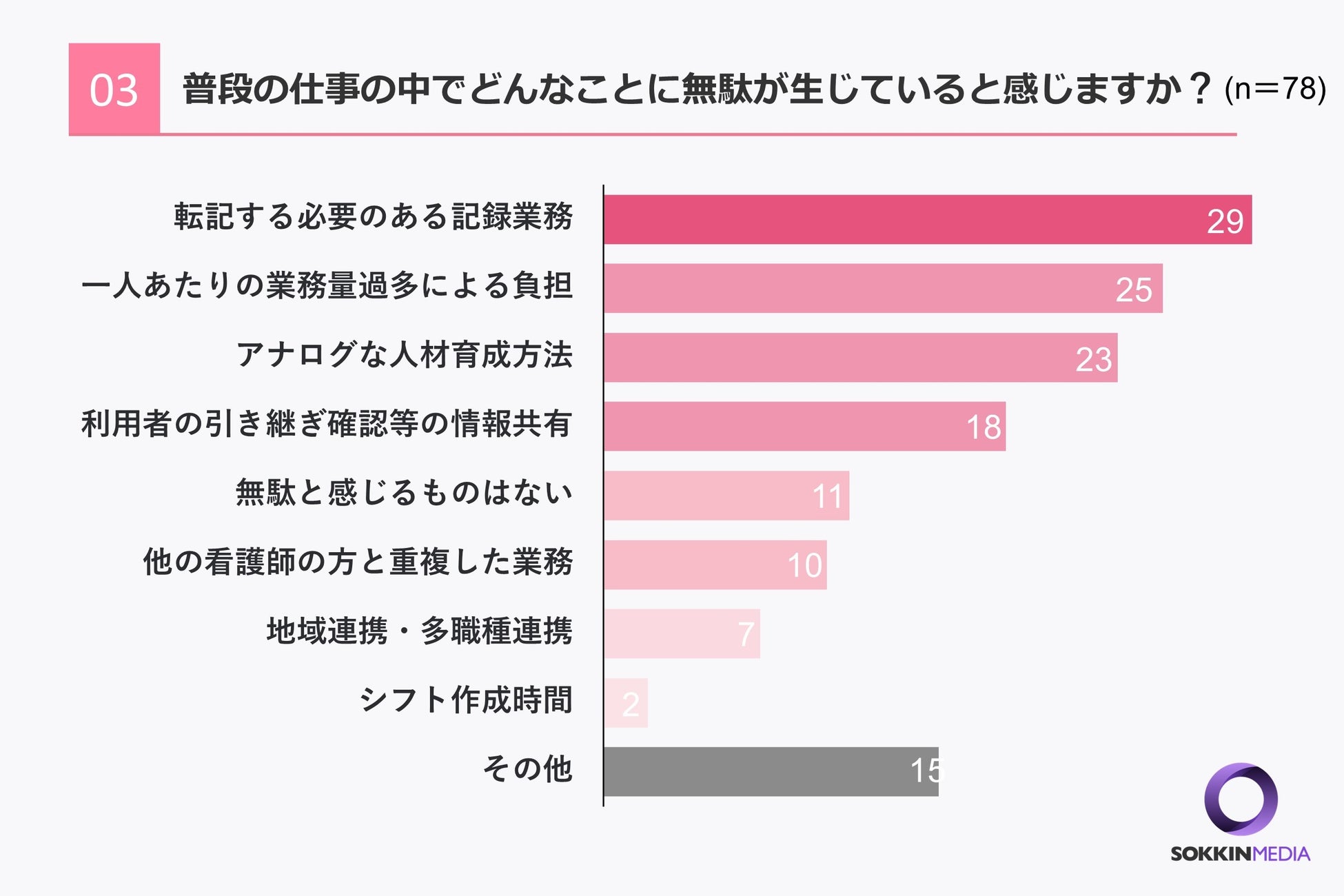 「Q3. 普段の仕事の中でどんなことに無駄が生じていると感じますか?」という問いに対して、「転記する必要のある記録業務」という回答が29票、次いで「1人当たりの業務過多による負担」という回答が25票という結果になりました。また「無駄と感じるものはない」という回答も11票集まりました。