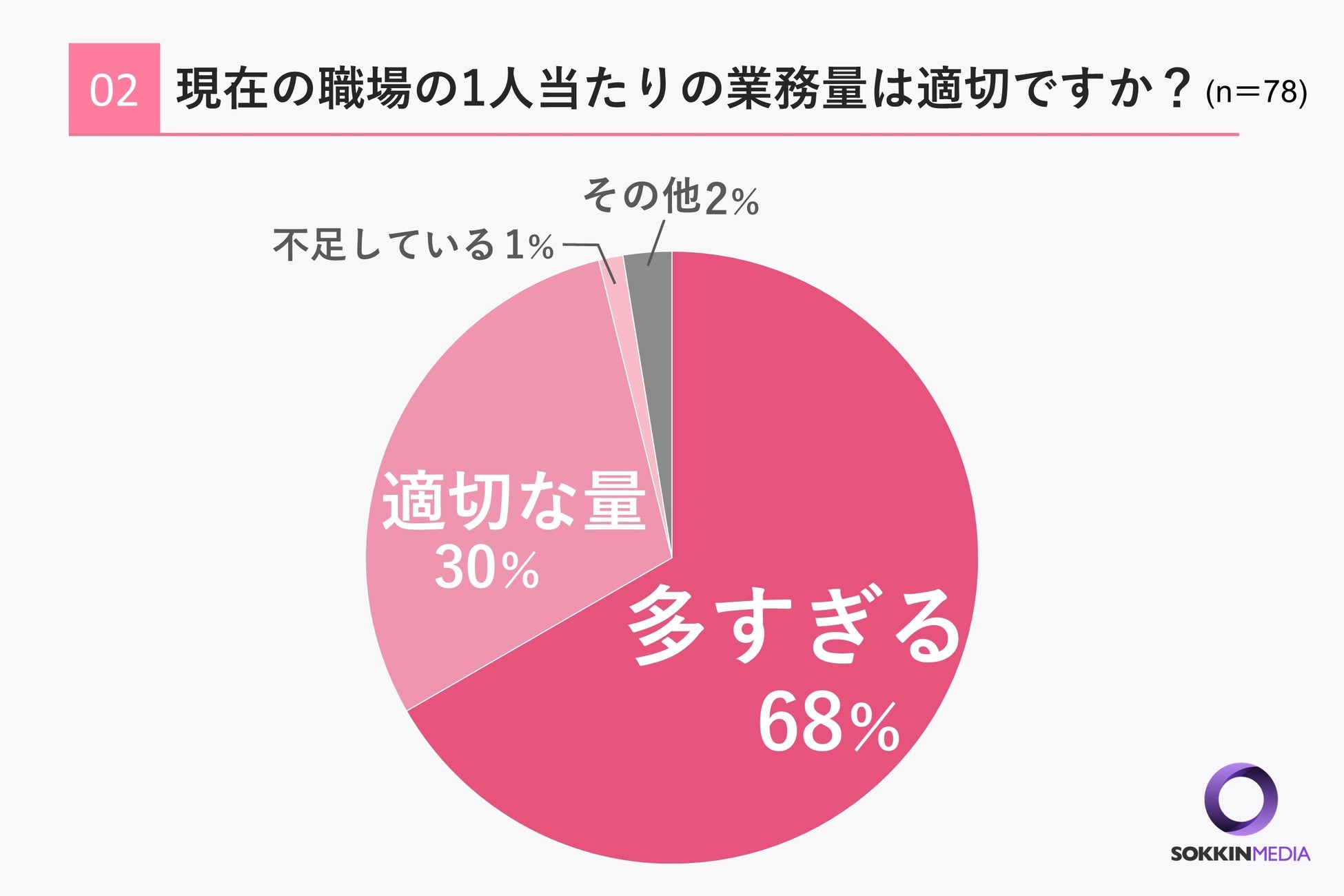 「Q2. 現在の職場の1人当たりの業務量は適切ですか? 」という問いに対して、「多すぎる」と回答した方が68%と最多であり、次いで「適切な量」と回答した方が30%という結果になりました。