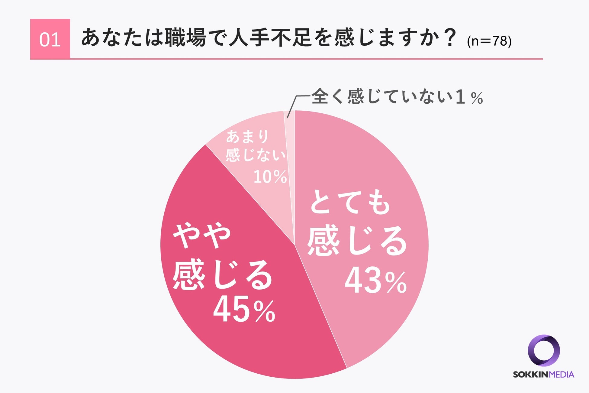 「Q1. あなたは職場で人手不足を感じますか?」という問いに対して、「やや感じる」という方が45%、ついで「とても感じる」という方が43%という結果になりました。回答した方の9割弱の方が人手不足を感じるということがわかりました。