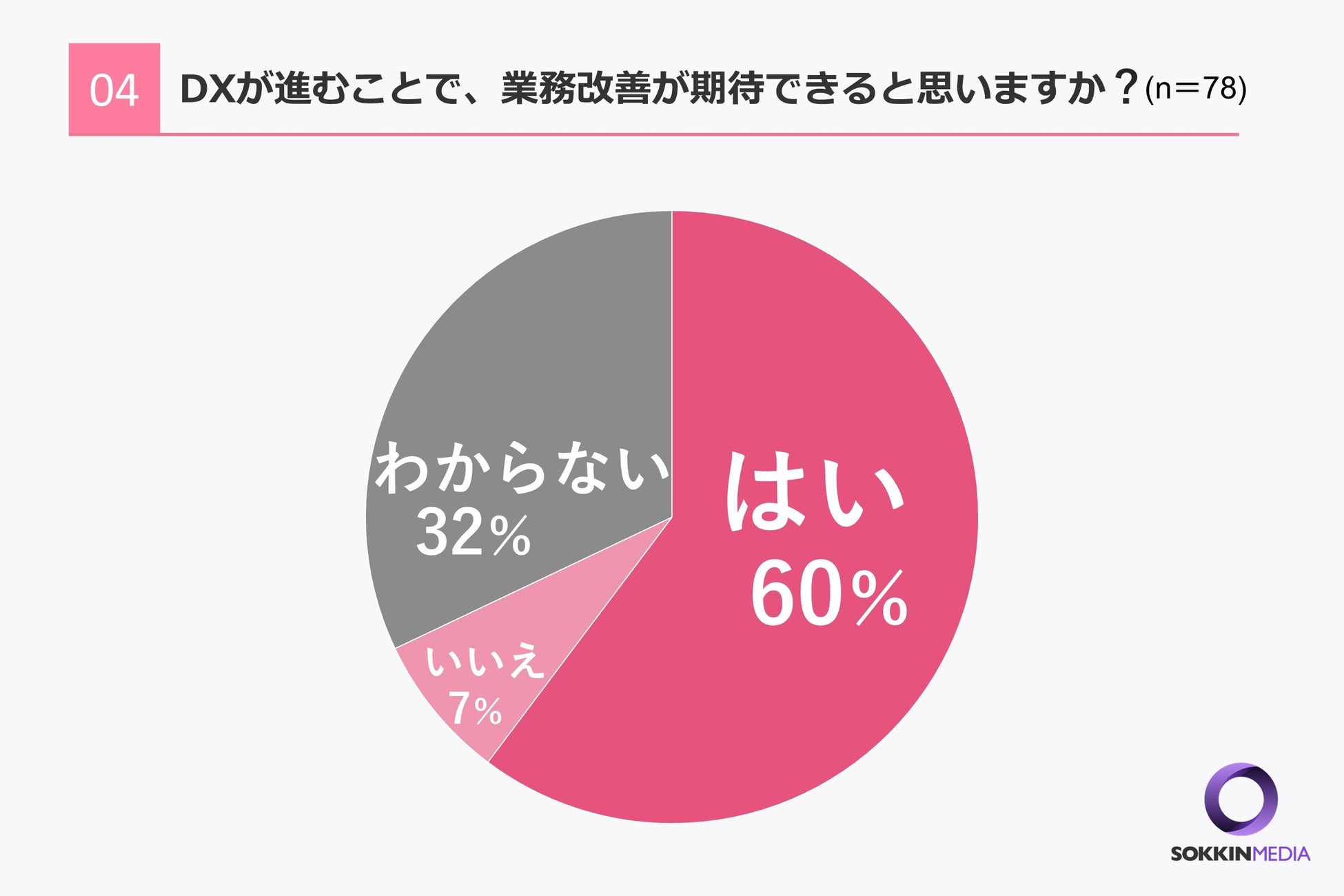 「Q4.デジタルトランスフォーメーション(DX)が進むことで、業務改善が期待できると思いますか?」という問いに対して「はい」と回答した方が最も多く60%、また「わからない」という回答が32%という結果になりました。認知していない方もまだ3割ほどいらっしゃるため、認知度の促進が求められます。