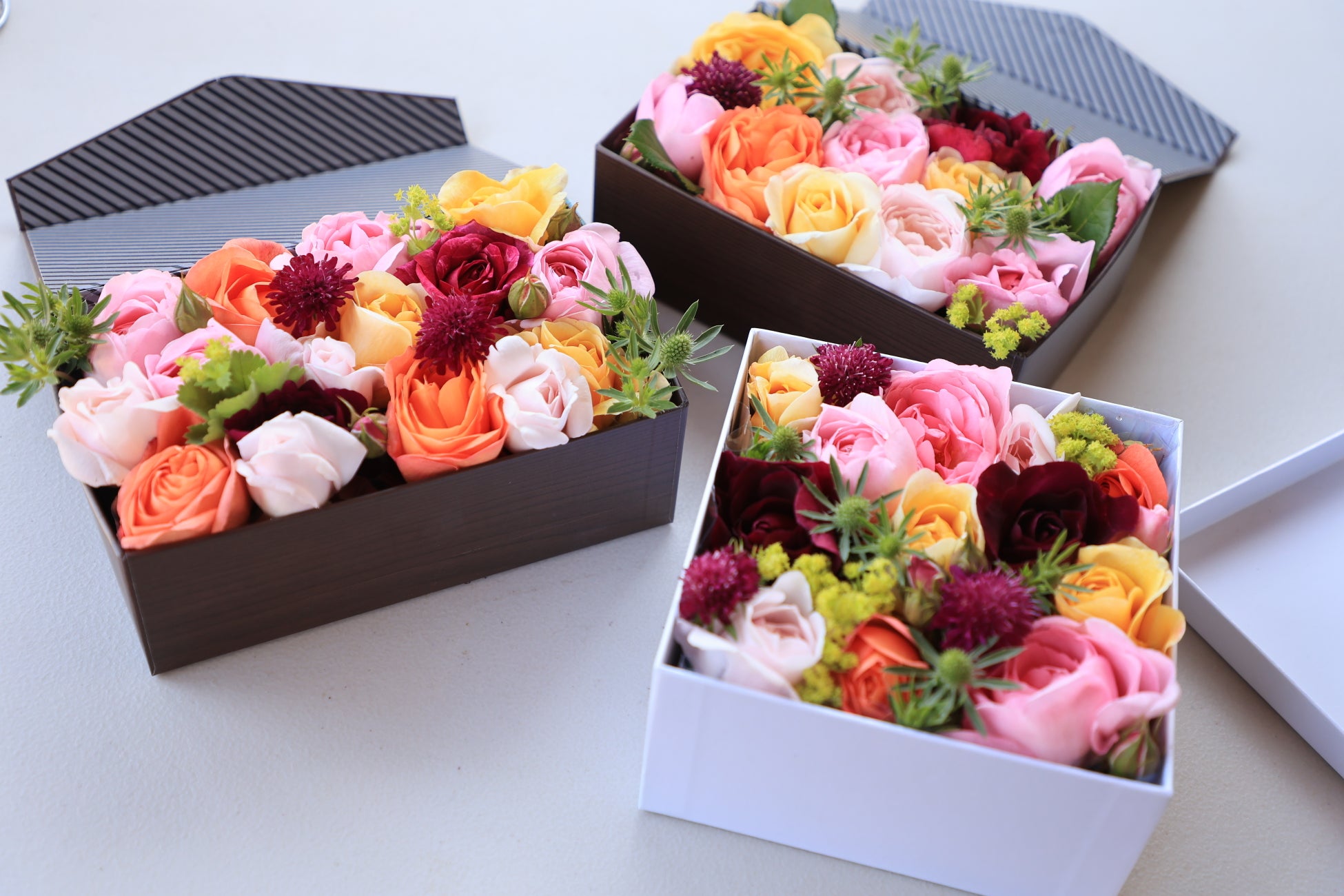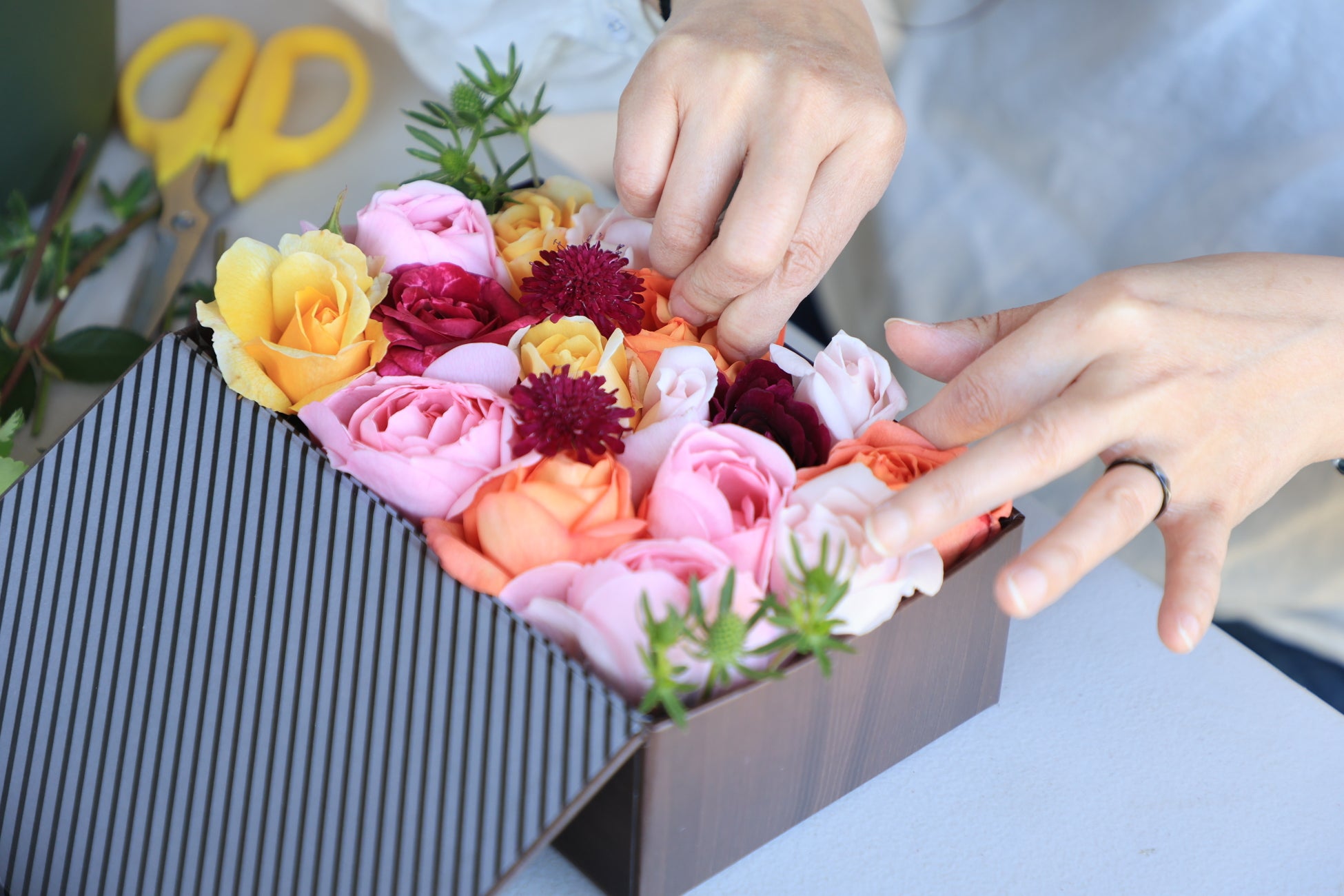 講師はデビッド・オースチン・ロージス 契約ガーデナー/ローズスペシャリストの平岡誠さんと世羅高原農場グループのフローリストです。イングリッシュローズや宿根草の解説を聞きながら園内のばらを摘み、フローリストのレクチャーを受けながらボックスフラワーにアレンジします。