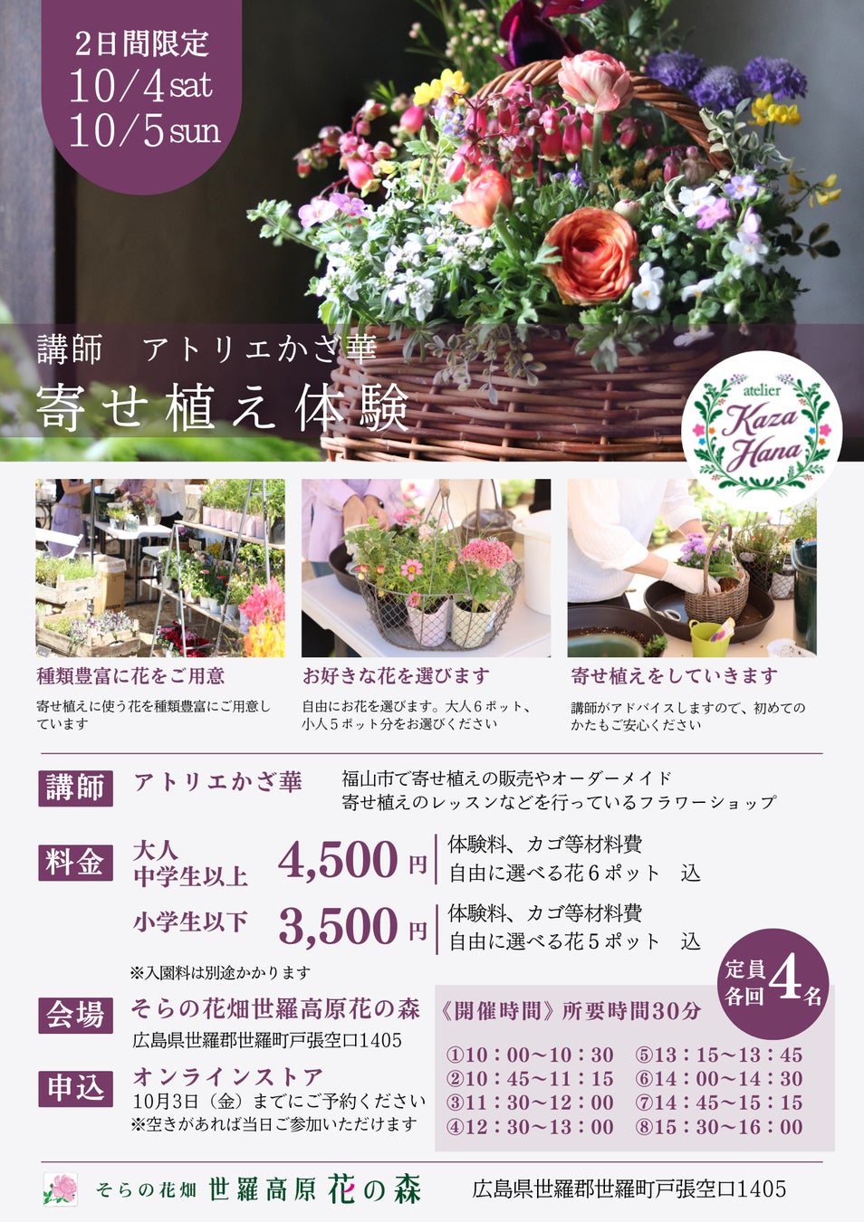 そらの花畑世羅高原花の森では現在「ローズ&フラワーガーデン」を開催中です。ばらや宿根草が見ごろを迎える10月、週末限定で特別なイベントをご用意しています。
