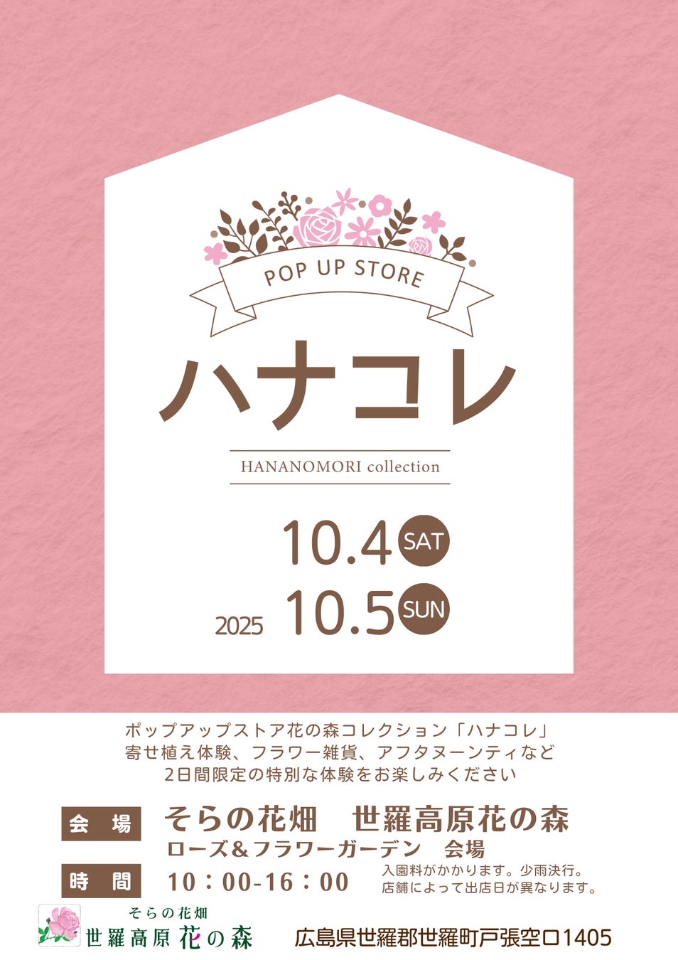 10月4日(土)・5日(日)の2日間限定でポップアップストア「ハナコレ」を開催します。ティータイムを過ごせる紅茶やスコーンの販売、寄せ植え体験、フラワー雑貨のワークショップ、フラワー小物の販売など、2日間だけの特別なポップアップストアです。