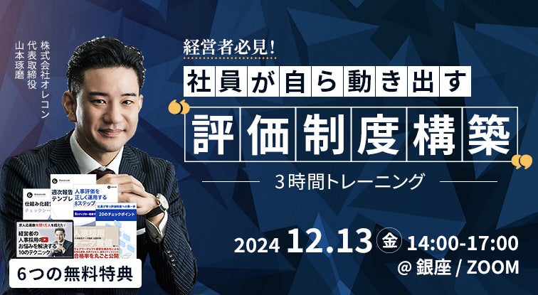 株式会社オレコン(本社:東京都港区、代表取締役:山本琢磨)は2024年12月13日開催:評価制度構築3時間トレーニングの申し込み受付を開始しました。