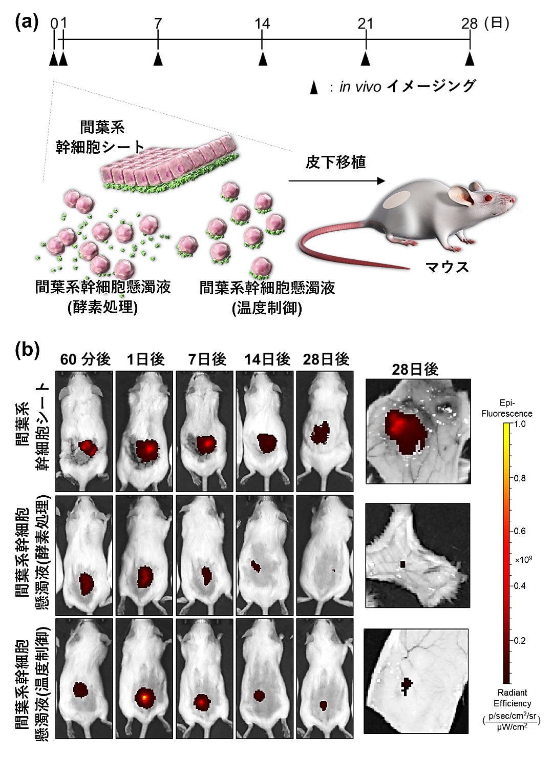 そこで本研究では、臍帯から採取した間葉系幹細胞の治療効果を解明しました。ヒト臍帯から採取した間葉系幹細胞を用いて間葉系幹細胞シートと間葉系幹細胞懸濁液を作製し、マウスの皮下組織に移植して生着率と分泌サイトカイン量を測定しました。間葉系幹細胞懸濁液は、移植後にすぐに消失してしまうのに対し、間葉系幹細胞シートは、長期間に渡り生着していることがわかりました。また、肝細胞増殖因子、形質転換増殖因子ベータ1などの治療に有効なサイトカインを大量に分泌していることがわかりました。
