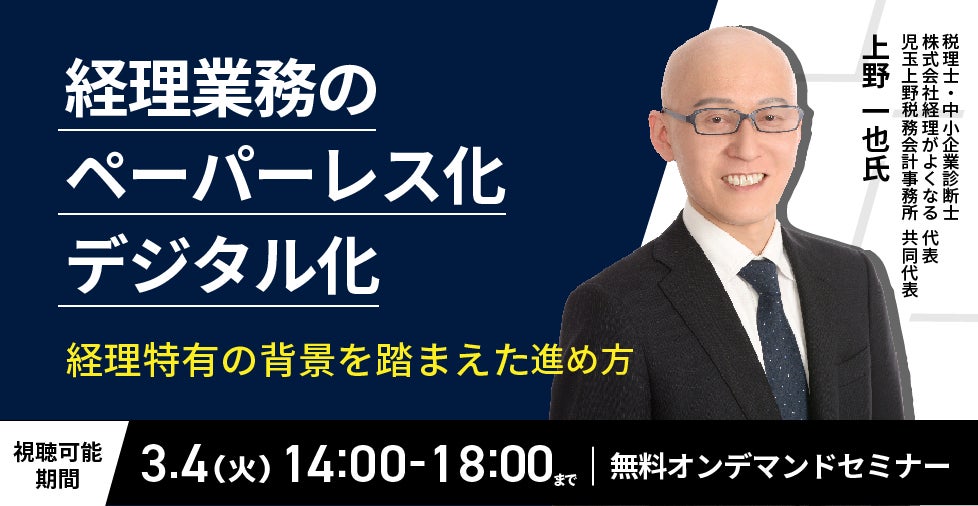 16,000社に対して経理BPOサービスを提供している、株式会社インボイス(代表取締役:加茂 正巳 本社:東京都千代田区)は、経理DXや経理事務を改善するためのシステム支援の専門家、税理士、株式会社経理がよくなる 代表/児玉上野税務会計事務所(本社:東京都渋谷区神南1-12-14-8F)共同代表の上野 一也 氏をお招きし、経理業務のペーパレス化、デジタル化の始め方や実際に成功した企業の事例紹介を通じて経理DXについての解説を行うオンデマンドセミナーを開催することになりましたのでお知らせいたします。