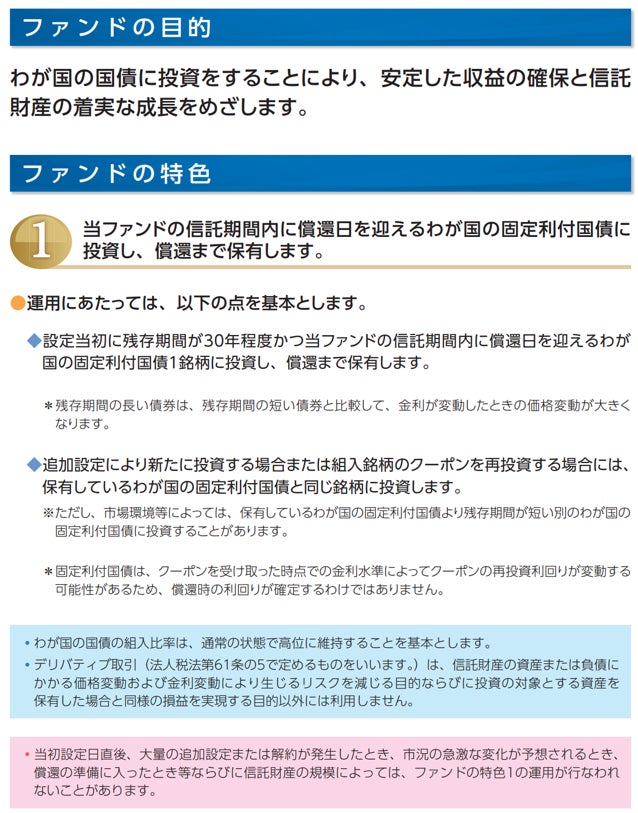 当ファンドは、当初の残存期間が約30年の超長期国債に投資し、償還まで保有する投資信託です。超長期国債に少額から投資することが可能になります。