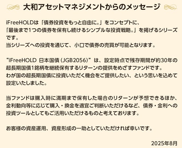 このたび、大和アセットマネジメント株式会社は、2025年8月21日に「iFreeHOLD 日本国債(JGB2056)」(以下、「当ファンド」)を設定します。