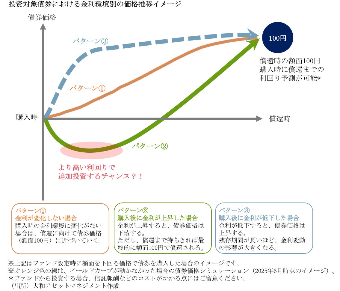 また、金利が低下(債券価格が上昇)した時は値上がり益が期待でき、逆に金利が上昇(債券価格が下落)した際には、より高い利回りで追加投資するチャンスにもなります。