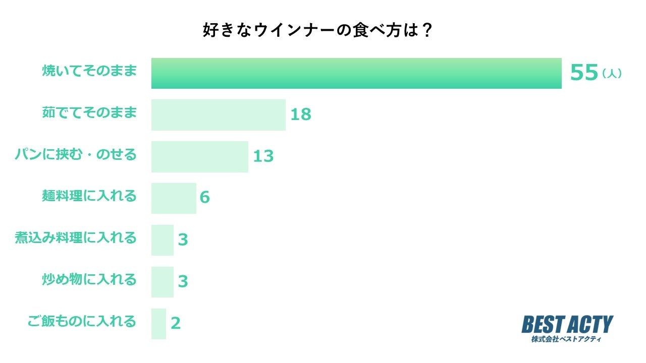 好きなウインナーの食べ方について100人にアンケートを行ったところ、「焼いてそのまま」と回答する人が最も多い結果となりました。