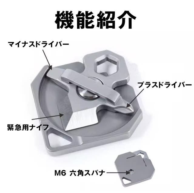 多くのツールは機能が限られていたり、単一の用途に特化していることが多いですが、このチタン合金マルチツールは、マイナスドライバー、プラスドライバー、M6六角レンチ、そして緊急用ナイフなど、複数の機能を集約しています。