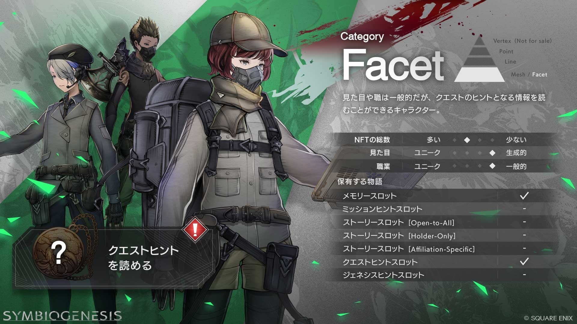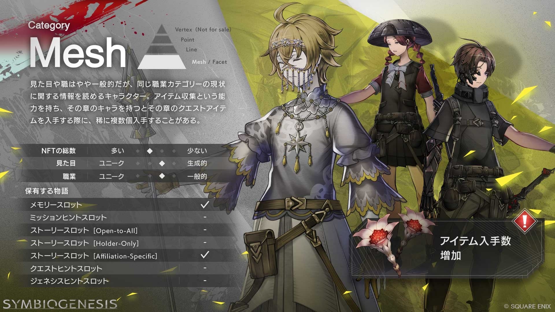 『SYMBIOGENESIS』では、キャラクターNFTを所持していると物語をより楽しむことができ、クエスト攻略や世界観考察を有利に進めることができます。