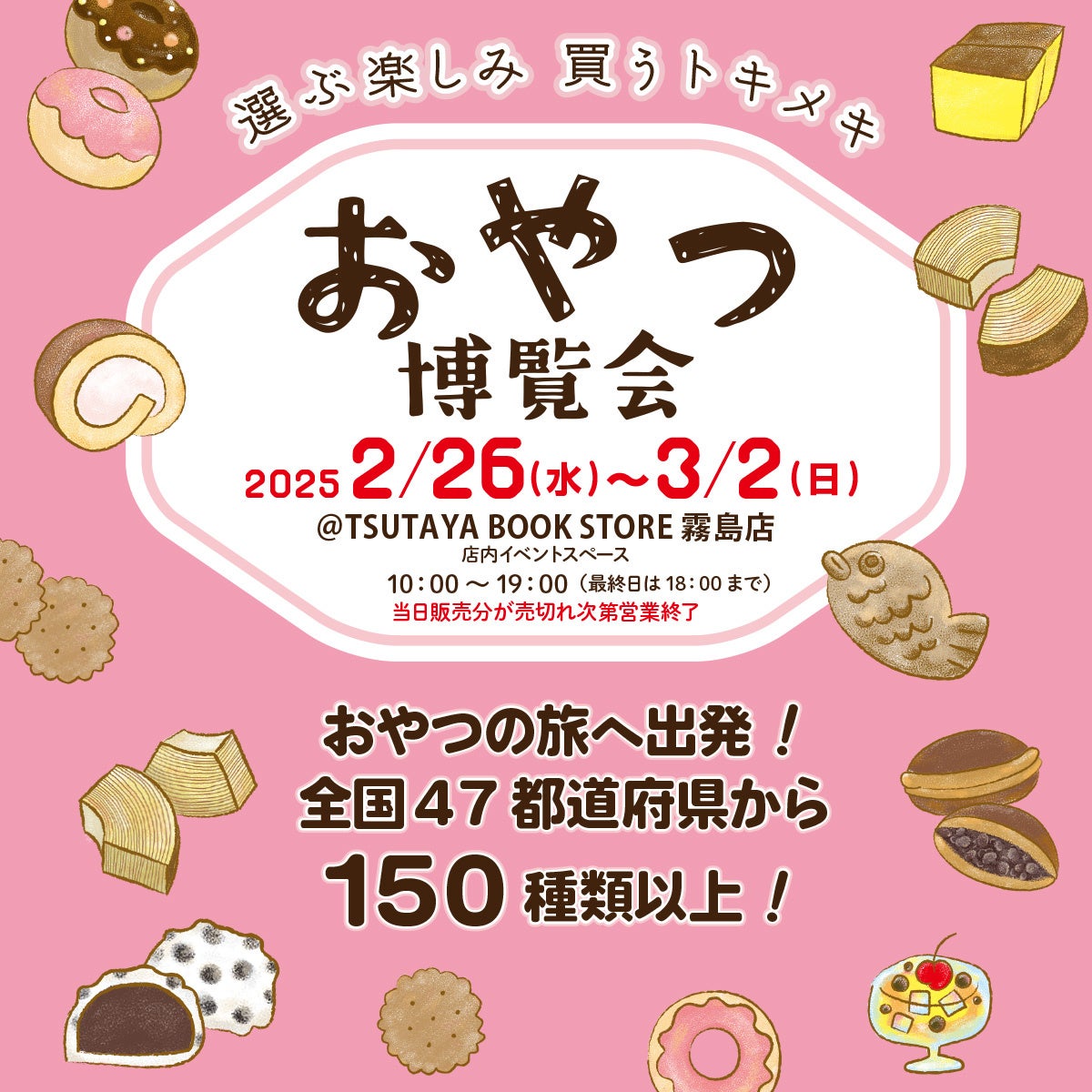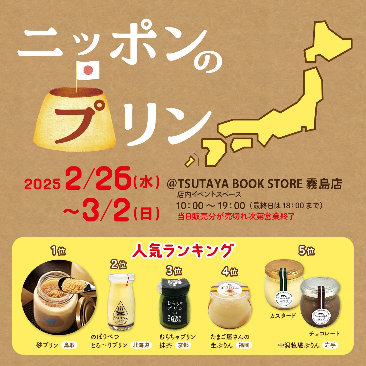 また、『全国パン博覧会』のあとには、鹿児島県内では2度目の開催の『おやつ博覧会』と初開催の『ニッポンのプリン』を「TSUTAYA BOOK STORE 霧島店」(鹿児島県霧島市)で2月26日(水)より開催します。