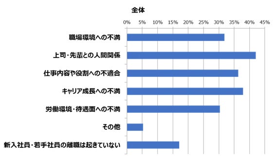 また、当社が実施した調査によると、「新入社員・若手社員の離職理由となっている要因」は、42%の組織が「上司・先輩との人間関係」と回答し、最も多い結果となりました。