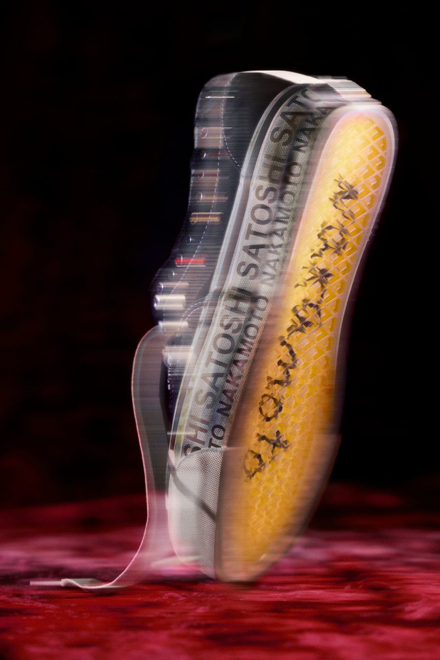足首まわりには丸いマルチカラーのジェムストーンを配し、解体的なシルエットの中に精緻なアクセントを加えています。サイドウォールには黒と黄のハンドワイプ仕上げによる自然な経年感を表現し、ディストレスド加工を施したフォクシングストライプがアーカイブ感をさらに強調。アウトソールには透き通った素材を採用し、歩くたびに「Satoshi Nakamoto」の文字が透けて見えるひそやかなディテールを忍ばせました。
