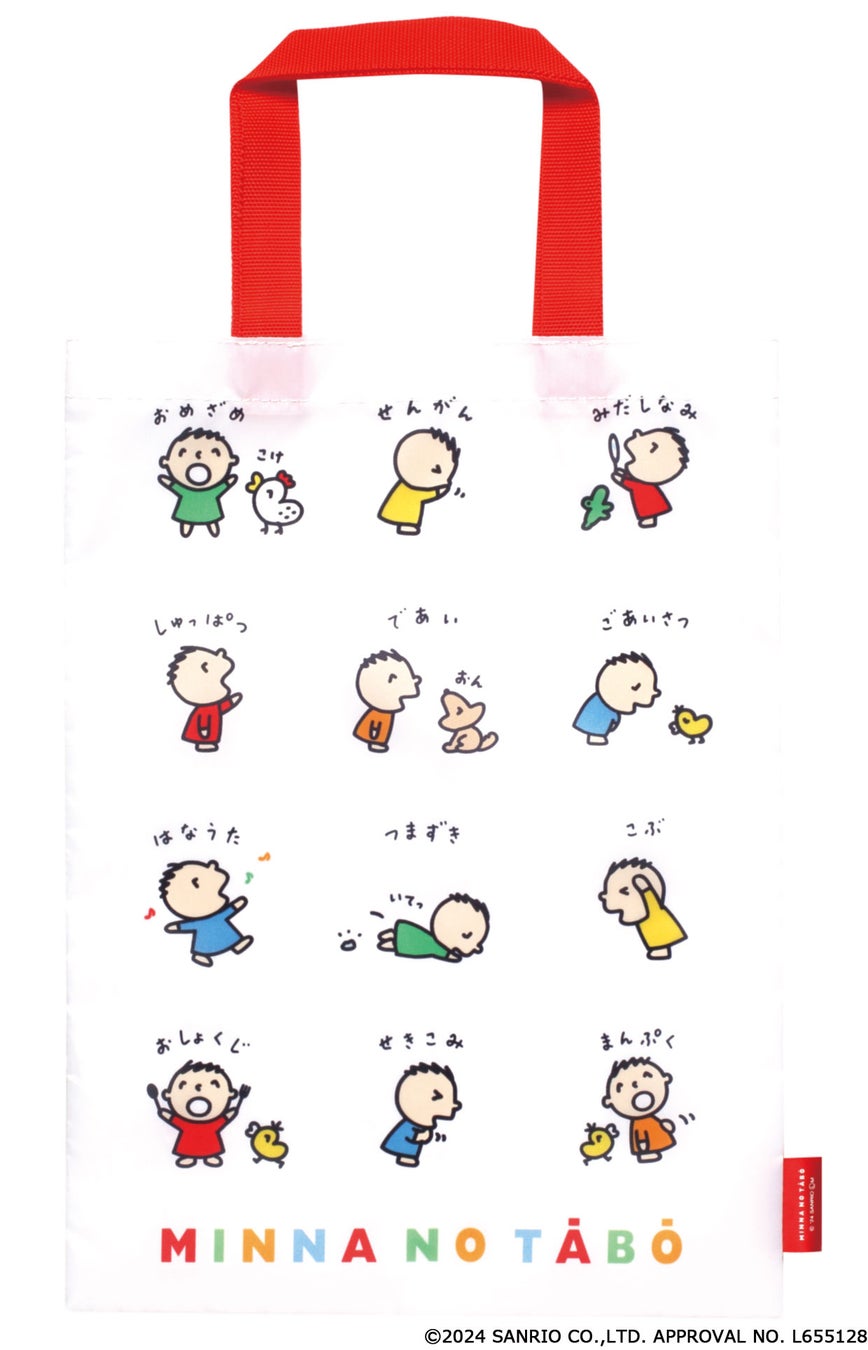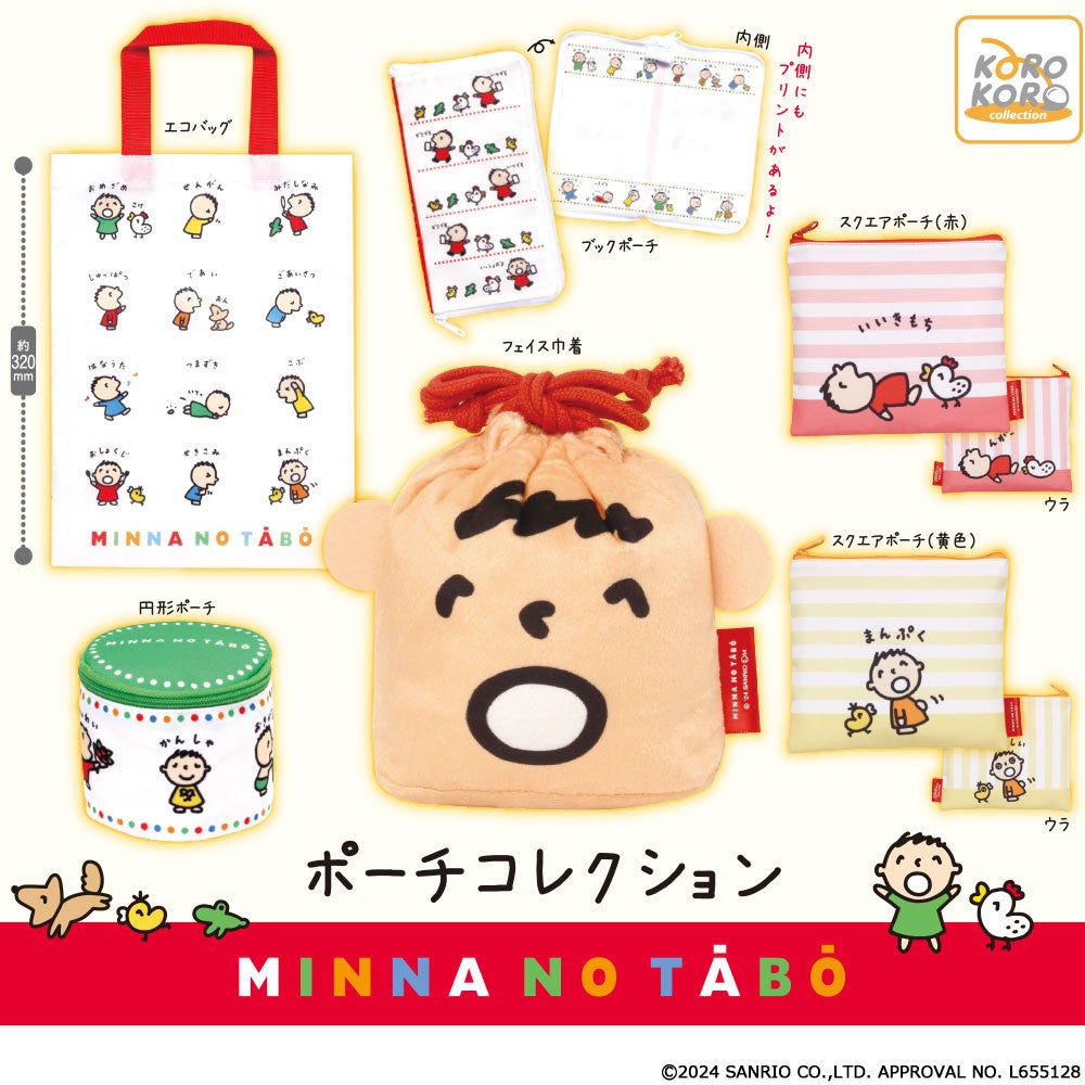 大容量の「エコバッグ」、小物整理にぴったりな「スクエアポーチ(赤)」「スクエアポーチ(黄色)」「円形ポーチ」、内面にも絵柄が入っている「ブックポーチ」、巾着の口を締めると顔になる「フェイス巾着」がラインナップ。